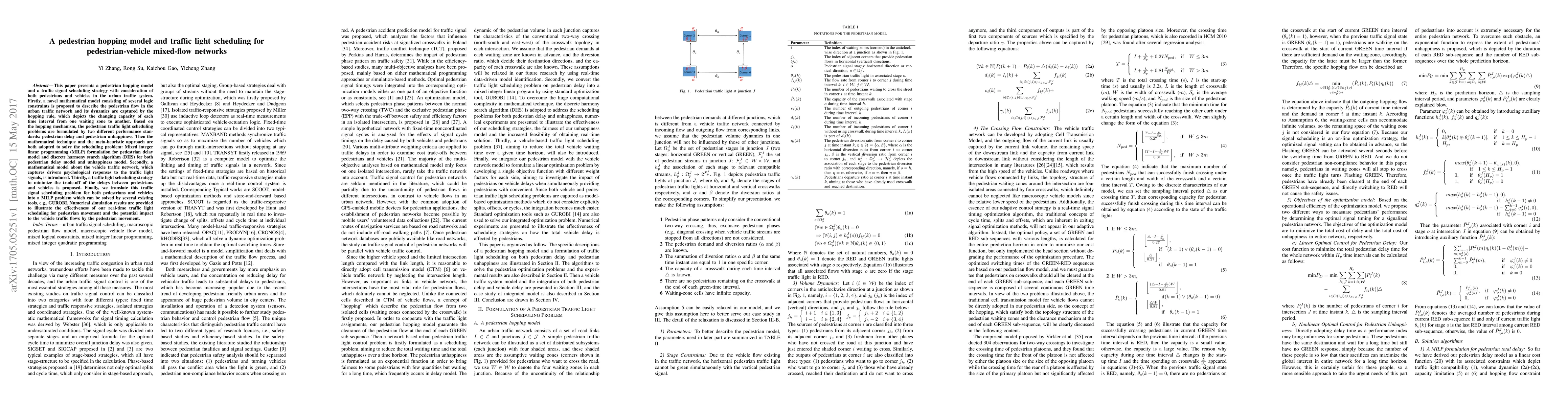This paper proposes a pedestrian hopping model and traffic light scheduling strategy for urban traffic networks, balancing pedestrian and vehicle flows. It uses a mixed integer linear programming approach and a discrete harmony search algorithm to optimize pedestrian delay and unhappiness, and introduces a mathematical model for vehicle traffic dynamics to minimize delays for both pedestrians and vehicles.