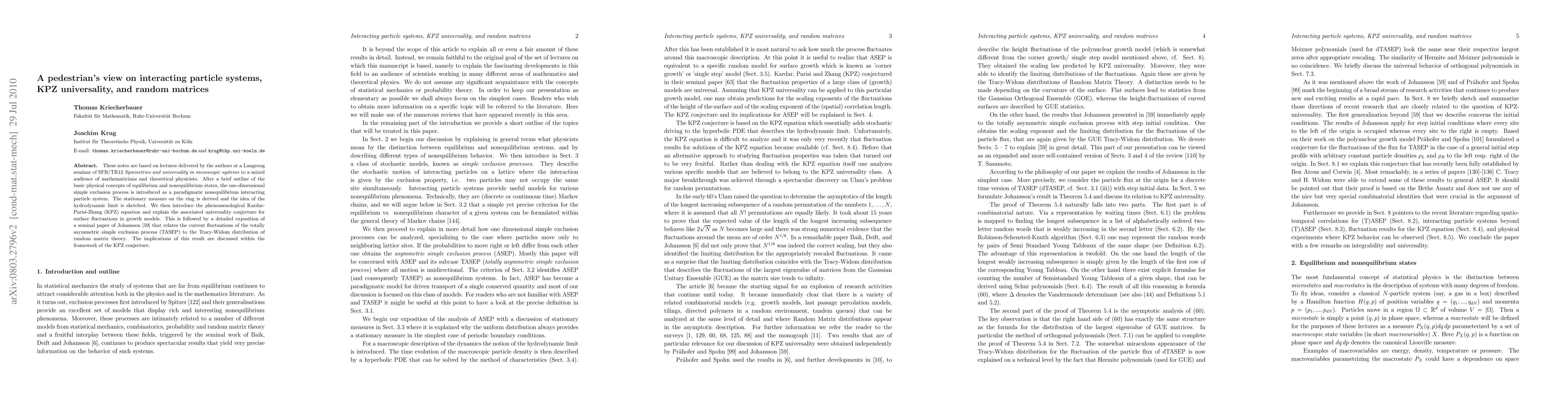 These notes are based on lectures delivered by the authors at a Langeoog seminar of SFB/TR12 "Symmetries and universality in mesoscopic systems" to a mixed audience of mathematicians and theoretical physicists. After a brief outline of the basic physical concepts of equilibrium and nonequilibrium states, the one-dimensional simple exclusion process is introduced as a paradigmatic nonequilibrium interacting particle system. The stationary measure on the ring is derived and the idea of the hydrodynamic limit is sketched. We then introduce the phenomenological Kardar-Parisi-Zhang (KPZ) equation and explain the associated universality conjecture for surface fluctuations in growth models. This is followed by a detailed exposition of a seminal paper of Johansson that relates the current fluctuations of the totally asymmetric simple exclusion process (TASEP) to the Tracy-Widom distribution of random matrix theory. The implications of this result are discussed within the framework of the KPZ conjecture.