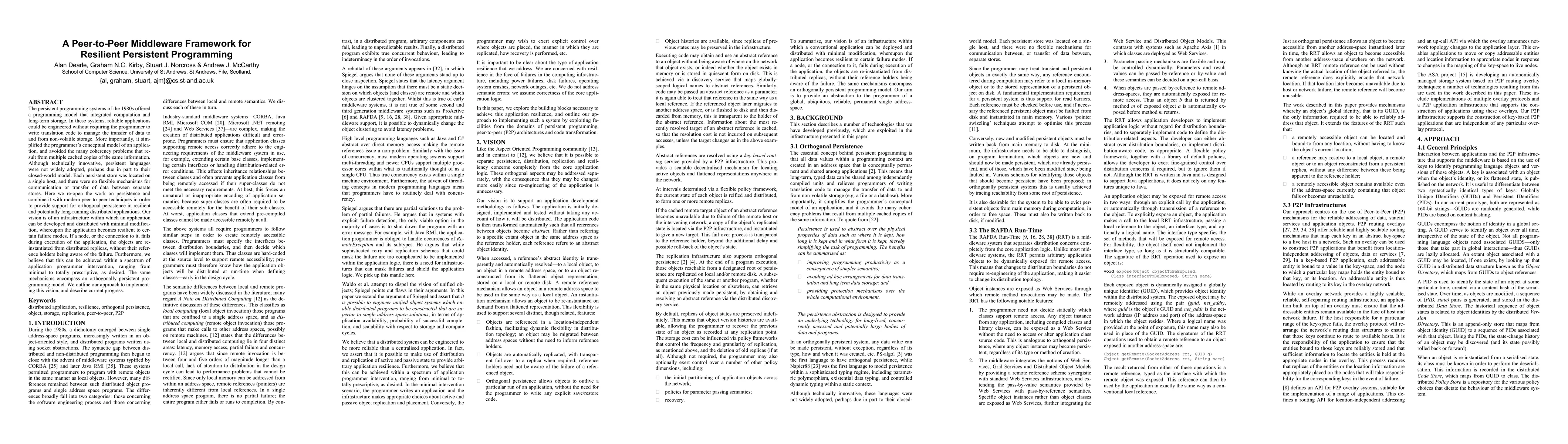 The persistent programming systems of the 1980s offered a programming model that integrated computation and long-term storage. In these systems, reliable applications could be engineered without requiring the programmer to write translation code to manage the transfer of data to and from non-volatile storage. More importantly, it simplified the programmer's conceptual model of an application, and avoided the many coherency problems that result from multiple cached copies of the same information. Although technically innovative, persistent languages were not widely adopted, perhaps due in part to their closed-world model. Each persistent store was located on a single host, and there were no flexible mechanisms for communication or transfer of data between separate stores. Here we re-open the work on persistence and combine it with modern peer-to-peer techniques in order to provide support for orthogonal persistence in resilient and potentially long-running distributed applications. Our vision is of an infrastructure within which an application can be developed and distributed with minimal modification, whereupon the application becomes resilient to certain failure modes. If a node, or the connection to it, fails during execution of the application, the objects are re-instantiated from distributed replicas, without their reference holders being aware of the failure. Furthermore, we believe that this can be achieved within a spectrum of application programmer intervention, ranging from minimal to totally prescriptive, as desired. The same mechanisms encompass an orthogonally persistent programming model. We outline our approach to implementing this vision, and describe current progress.