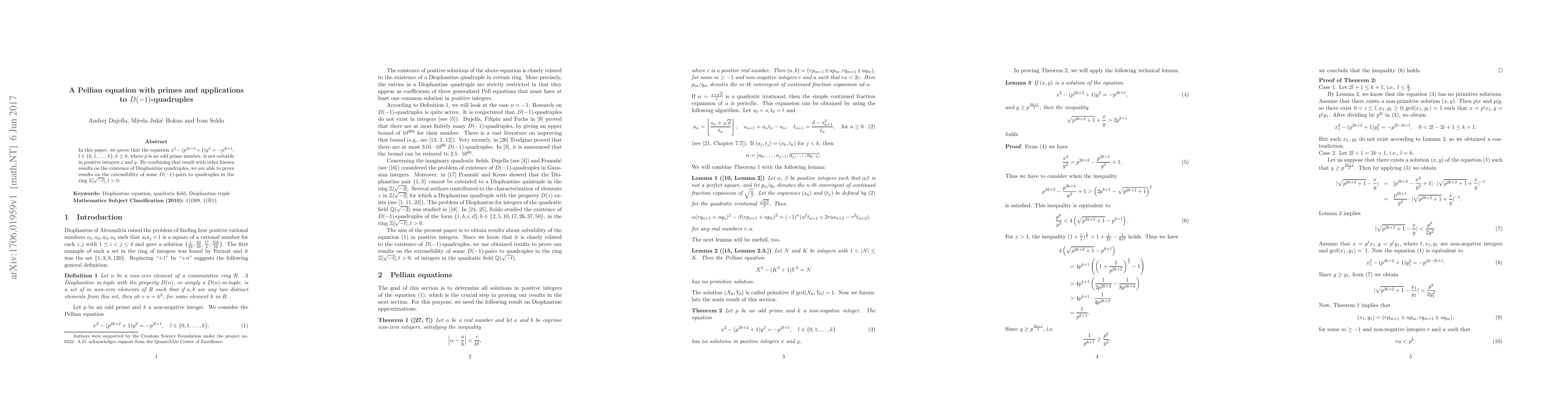 This paper proves that the Pellian equation $x^2-(p^{2k+2}+1)y^2=-p^{2l+1}$ has no positive integer solutions for odd primes $p$ and $l \in \{0,1,\dots,k\}$. It then uses this result to establish new findings on the extensibility of $D(-1)$-pairs to quadruples in the ring $\mathbb{Z}[\sqrt{-t}]$ for $t>0$.