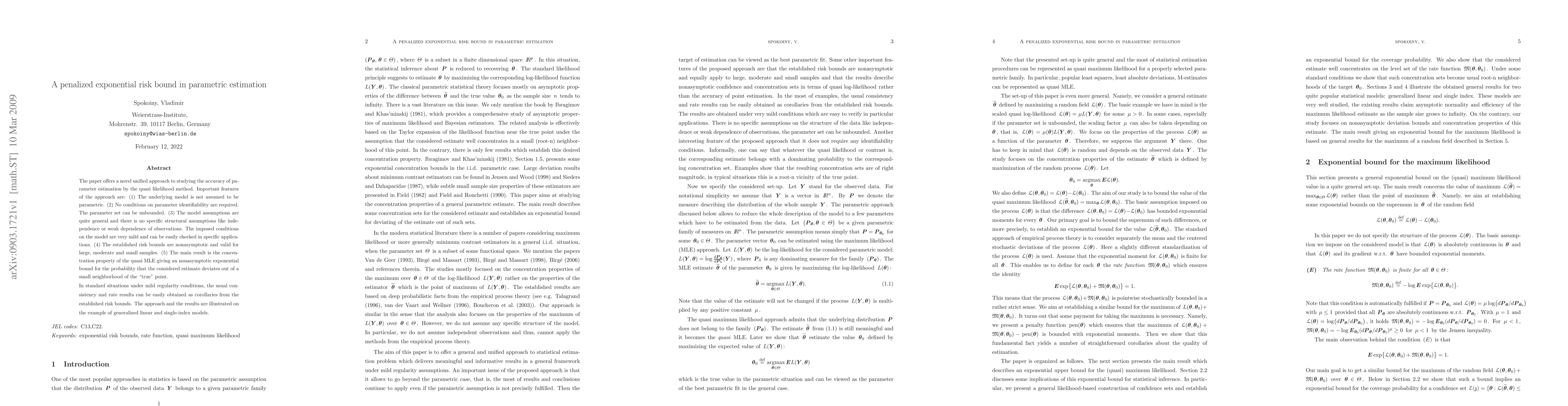 The paper offers a novel unified approach to studying the accuracy of parameter estimation by the quasi likelihood method. Important features of the approach are: (1) The underlying model {is not assumed to be parametric}. (2) No conditions on parameter identifiability are required. The parameter set can be unbounded. (3) The model assumptions are quite general and there is no specific structural assumptions like independence or weak dependence of observations. The imposed conditions on the model are very mild and can be easily checked in specific applications. (4) The established risk bounds are {nonasymptotic} and valid for large, moderate and small samples. (5) The main result is the concentration property of the quasi MLE giving an nonasymptotic exponential bound for the probability that the considered estimate deviates out of a small neighborhood of the "true" point. In standard situations under mild regularity conditions, the usual consistency and rate results can be easily obtained as corollaries from the established risk bounds. % The approach and the results are illustrated on the example of generalized linear and single-index models.