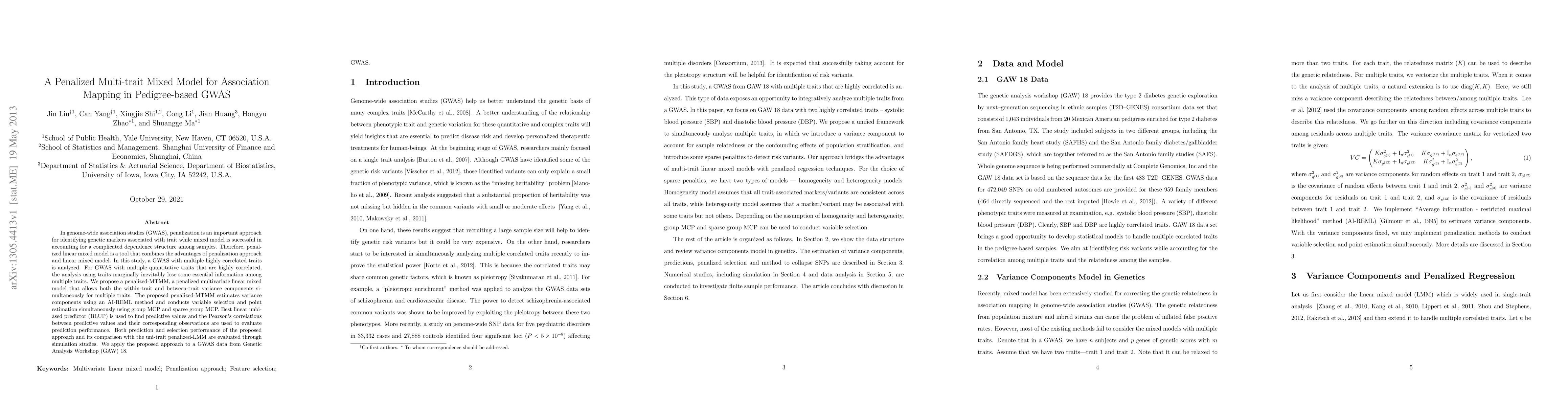 This paper proposes a penalized multivariate linear mixed model (penalized-MTMM) for genome-wide association studies (GWAS) involving multiple highly correlated traits, aiming to retain essential information across traits. The method combines variance component estimation, variable selection, and predictive performance evaluation, and is compared with uni-trait models through simulation studies and applied to GWAS data from Genetic Analysis Workshop (GAW) 18.