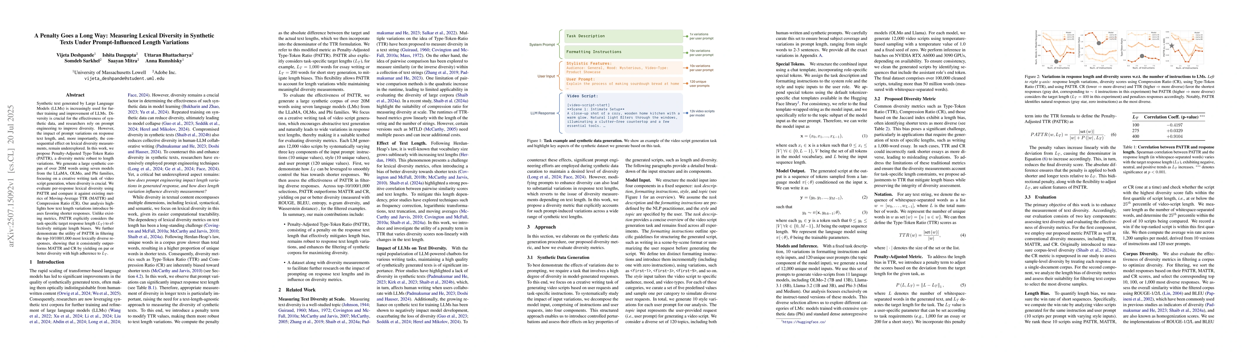 Synthetic text generated by Large Language Models (LLMs) is increasingly used for further training and improvement of LLMs. Diversity is crucial for the effectiveness of synthetic data, and researchers rely on prompt engineering to improve diversity. However, the impact of prompt variations on response text length, and, more importantly, the consequential effect on lexical diversity measurements, remain underexplored. In this work, we propose Penalty-Adjusted Type-Token Ratio (PATTR), a diversity metric robust to length variations. We generate a large synthetic corpus of over 20M words using seven models from the LLaMA, OLMo, and Phi families, focusing on a creative writing task of video script generation, where diversity is crucial. We evaluate per-response lexical diversity using PATTR and compare it against existing metrics of Moving-Average TTR (MATTR) and Compression Ratio (CR). Our analysis highlights how text length variations introduce biases favoring shorter responses. Unlike existing metrics, PATTR explicitly considers the task-specific target response length ($L_T$) to effectively mitigate length biases. We further demonstrate the utility of PATTR in filtering the top-10/100/1,000 most lexically diverse responses, showing that it consistently outperforms MATTR and CR by yielding on par or better diversity with high adherence to $L_T$.