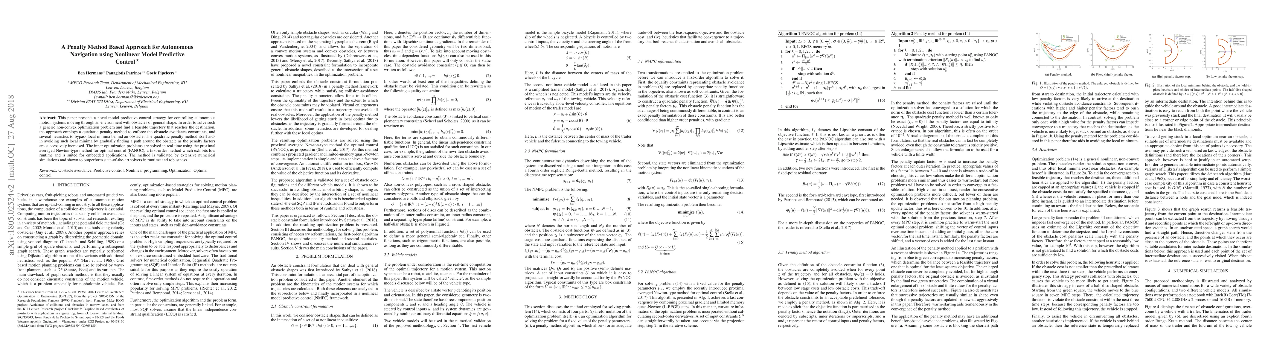 This paper introduces a model predictive control strategy using a quadratic penalty method for autonomous navigation, effectively avoiding obstacles and bypassing local minima. The proximal averaged Newton-type method (PANOC) is employed for real-time optimization, demonstrating superior runtime and robustness compared to existing solvers.