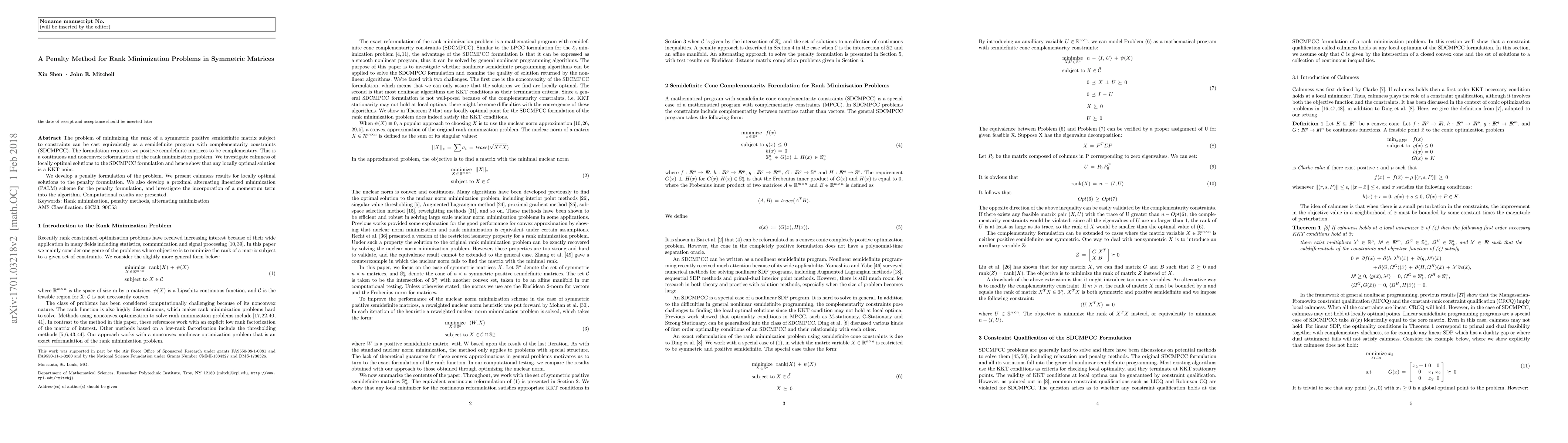 This paper proposes a penalty method for solving rank minimization problems in symmetric matrices, reformulated as a semidefinite program with complementarity constraints. It demonstrates that locally optimal solutions are KKT points and introduces a proximal alternating linearized minimization (PALM) scheme enhanced with a momentum term for efficient computation.