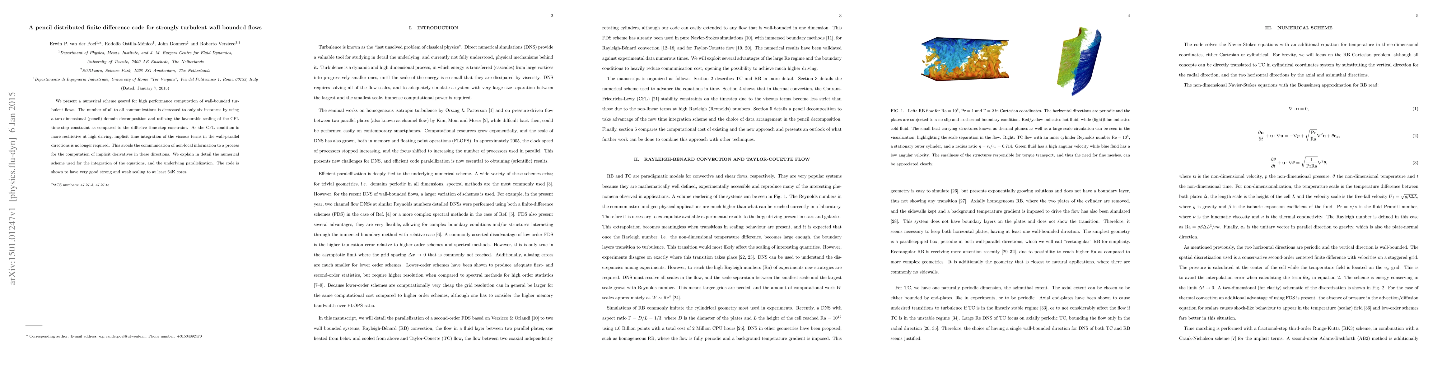 This paper introduces a high-performance finite difference code for computing strongly turbulent wall-bounded flows, utilizing a two-dimensional pencil domain decomposition to minimize all-to-all communications to just six instances. The scheme avoids the need for implicit time integration in wall-parallel directions, demonstrating excellent scaling to large numbers of cores.