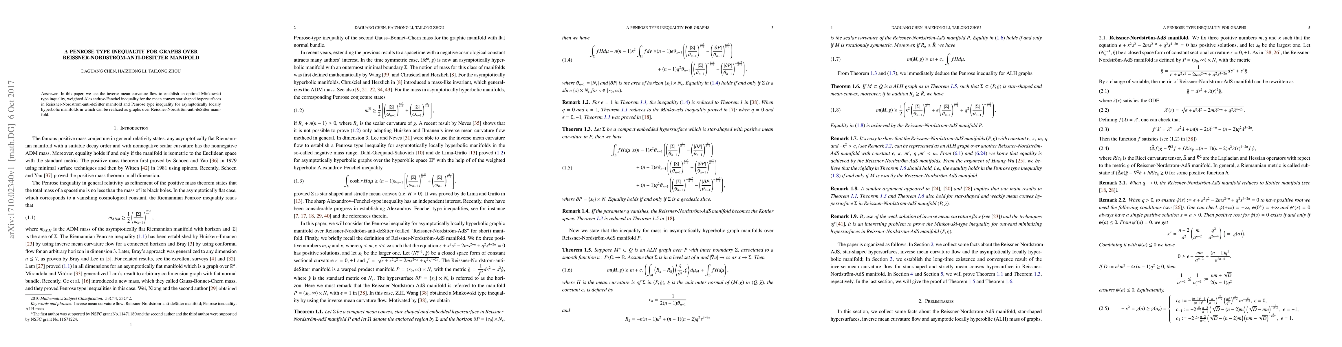 In this paper, we use the inverse mean curvature flow to establish an optimal Minkowski type inquality, weighted Alexandrov-Fenchel inequality for the mean convex star shaped hypersurfaces in Reissner-Nordstr\"om-anti-deSitter manifold and Penrose type inequality for asymptotically locally hyperbolic manifolds in which can be realized as graphs over Reissner-Nordstr\"om-anti-deSitter manifold.