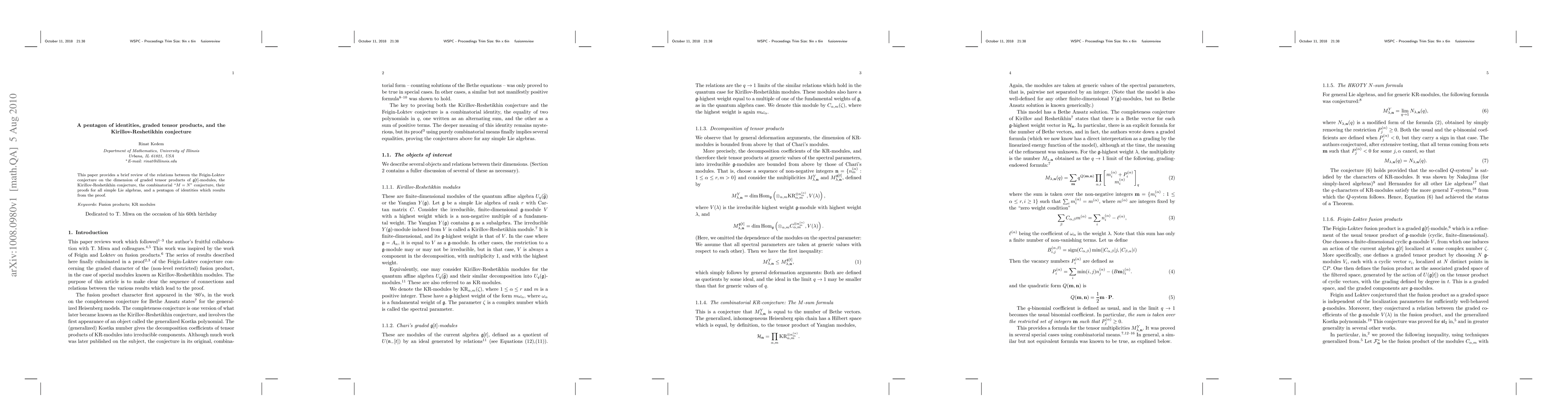 This paper provides a brief review of the relations between the Feigin-Loktev conjecture on the dimension of graded tensor products of $\g[t]$-modules, the Kirillov-Reshetikhin conjecture, the combinatorial ``M=N" conjecture, their proofs for all simple Lie algebras, and a pentagon of identities which results from the proof.