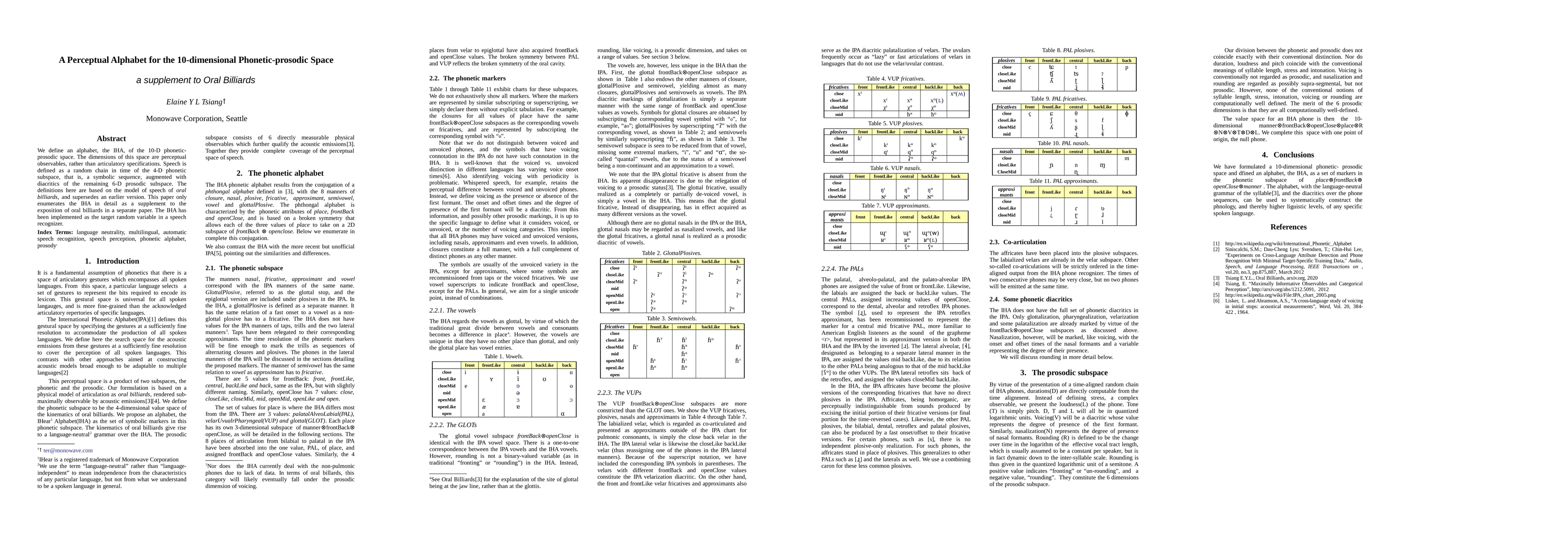 We define an alphabet, the IHA, of the 10-D phonetic-prosodic space. The dimensions of this space are perceptual observables, rather than articulatory specifications. Speech is defined as a random chain in time of the 4-D phonetic subspace, that is, a symbolic sequence, augmented with diacritics of the remaining 6-D prosodic subspace. The definitions here are based on the model of speech of oral billiards, and supersedes an earlier version. This paper only enumerates the IHA in detail as a supplement to the exposition of oral billiards in a separate paper. The IHA has been implemented as the target random variable in a speech recognizer.