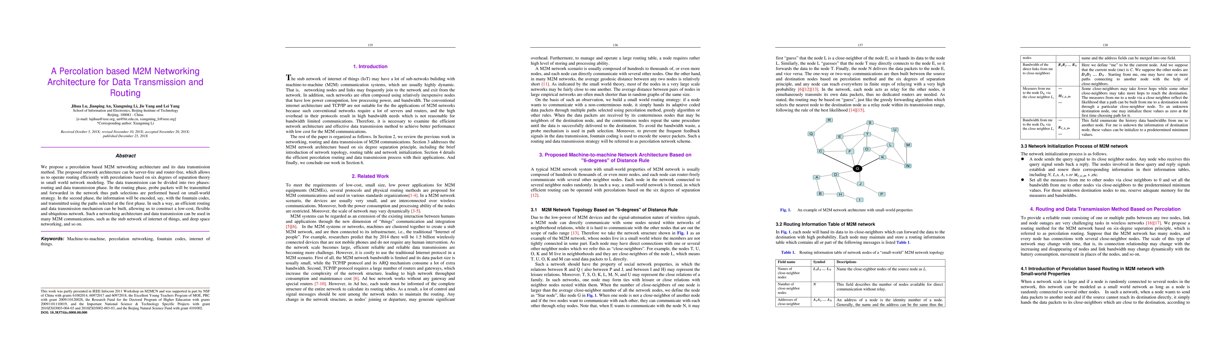 A percolation-based M2M networking architecture proposes a server-free and router-free network design for efficient data transmission and routing using six degrees of separation theory. The approach enables low-cost, flexible, and ubiquitous networks suitable for IoT and deep space applications.
