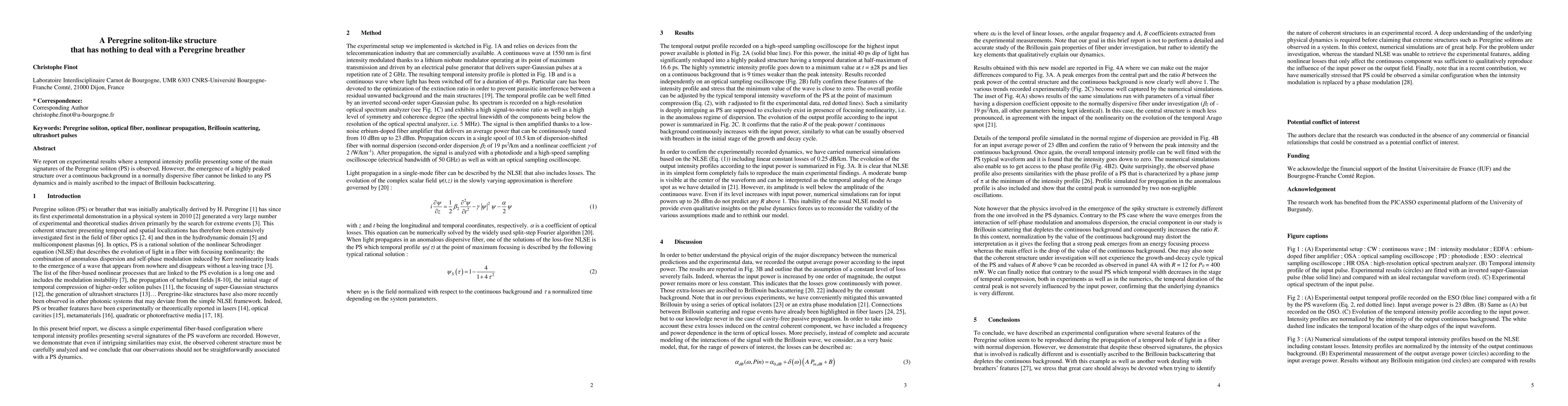 Summary: Experimental observations reveal a temporal intensity profile resembling a Peregrine soliton, but the peaked structure in a dispersive fiber is attributed to Brillouin backscattering rather than Peregrine soliton dynamics.
