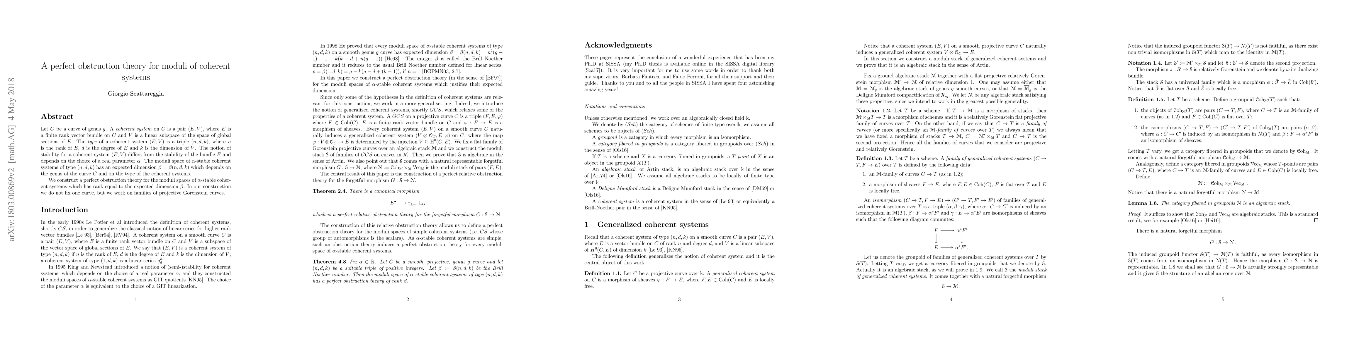 The paper introduces a perfect obstruction theory for moduli spaces of α-stable coherent systems on curves, which has an expected dimension equal to the genus of the curve.