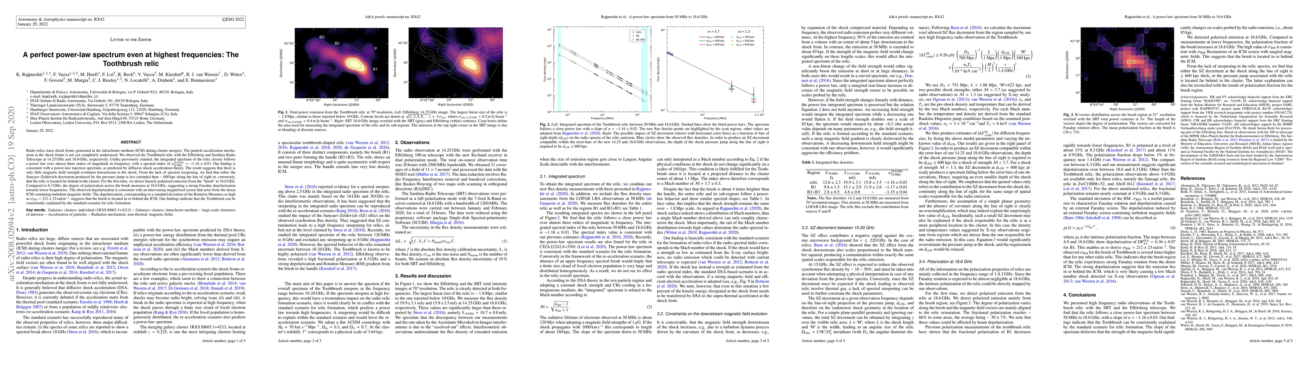 Radio relics trace shock fronts generated in the intracluster medium (ICM) during cluster mergers. The particle acceleration mechanism at the shock fronts is not yet completely understood. We observed the Toothbrush relic with the Effelsberg and Sardinia Radio Telescope at 14.25 GHz and 18.6 GHz, respectively. Unlike previously claimed, the integrated spectrum of the relic closely follows a power law over almost three orders of magnitude in frequency, with a spectral index of $\alpha_{\rm 58\,MHz}^{\rm 18.6\,GHz}=-1.16\pm0.03$. Our finding is consistent with a power-law injection spectrum, as predicted by diffusive shock acceleration theory. The result suggests that there is only little magnetic field strength evolution downstream to the shock. From the lack of spectral steepening, we find that either the Sunyaev-Zeldovich decrement produced by the pressure jump is less extended than $\sim$ 600\,kpc along the line of sight or, conversely, that the relic is located far behind in the cluster. For the first time, we detect linearly polarized emission from the "brush" at 18.6 GHz. Compared to 8.3 GHz, the degree of polarization across the brush increases at 18.6 GHz, suggesting a strong Faraday depolarization towards lower frequencies. The observed depolarization is consistent with an intervening magnetized screen that arise from the dense ICM containing turbulent magnetic fields. The depolarization, corresponding to a standard deviation of the Rotation Measures as high as $\sigma_{\rm RM}= 212\pm23\rm \,rad\,m^{-2}$, suggests that the brush is located in or behind the ICM. Our findings indicate that the Toothbrush can be consistently explained by the standard scenario for relic formation