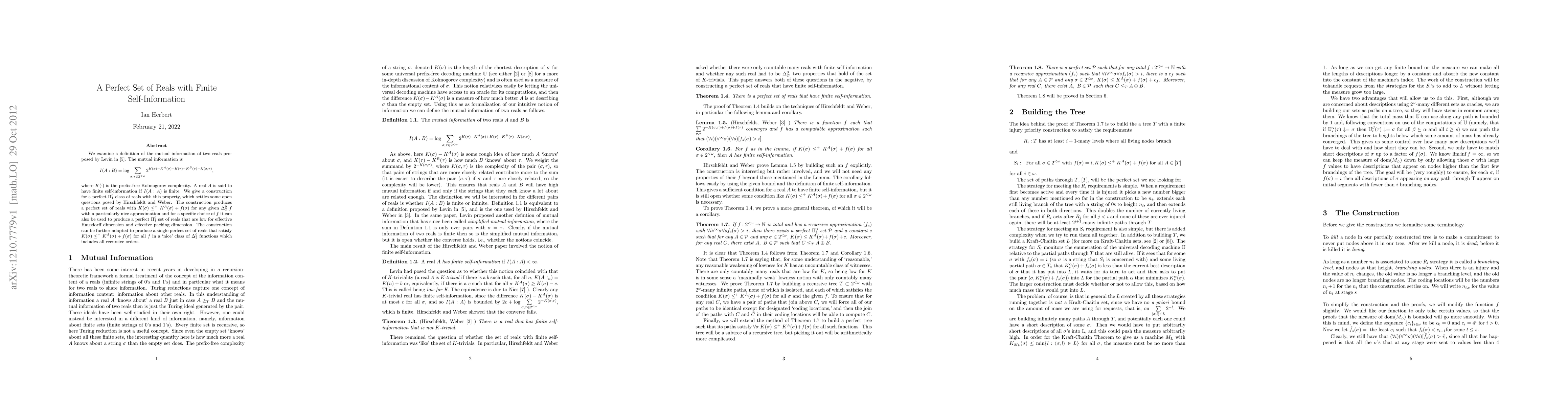 We examine a definition of the mutual information of two reals proposed by Levin. The mutual information is I(X:Y)=log(sum(2^{K(s)-K^X(s)+K(t)-K^Y(t)-K(s,t)}, (s,t) pairs of finite binary strings), where K is the prefix-free Kolmogorov complexity. A real X is said to have finite self-information if I(X:X) is finite. We give a construction for a perfect Pi^0_1 set of reals with this property, which settles some open questions posed by Hirschfeldt and Weber. The construction produces a perfect set of reals with K(s)<= K^{A}(s)+f(s)+c for a certain constant c and for any given Delta^0_2 f with a particularly nice approximation and for a specific choice of f it can also be used to produce a perfect Pi^0_1 set of reals that are low for effective Hausdorff dimension and effective packing dimension. The construction can be further adapted to produce a single perfect set of reals that satisfy K(s) <= K^A(s)+f(s)+c_f, where c_f is a constant that depends on f, for all f in a `nice' class of Delta^0_2 functions which includes all recursive orders.