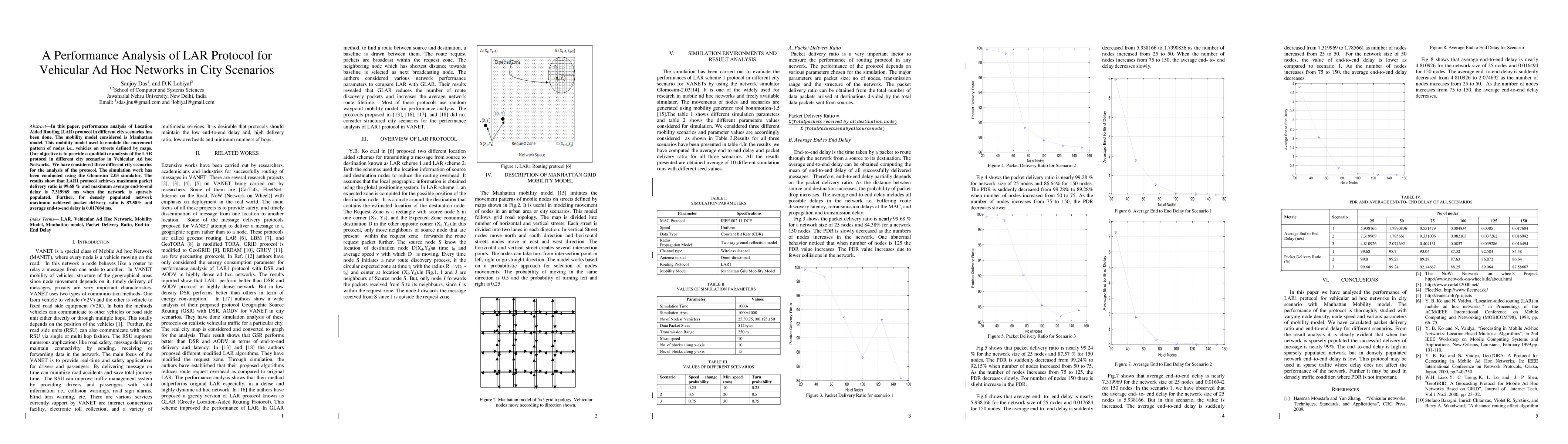 This paper analyzes the performance of the Location Aided Routing (LAR) protocol in various city scenarios using the Manhattan mobility model. Simulation results show that LAR1 achieves a high packet delivery ratio of 99.68% in sparse networks and 87.58% in dense networks, with corresponding end-to-end delays of 7.319969 ms and 0.017684 ms respectively.