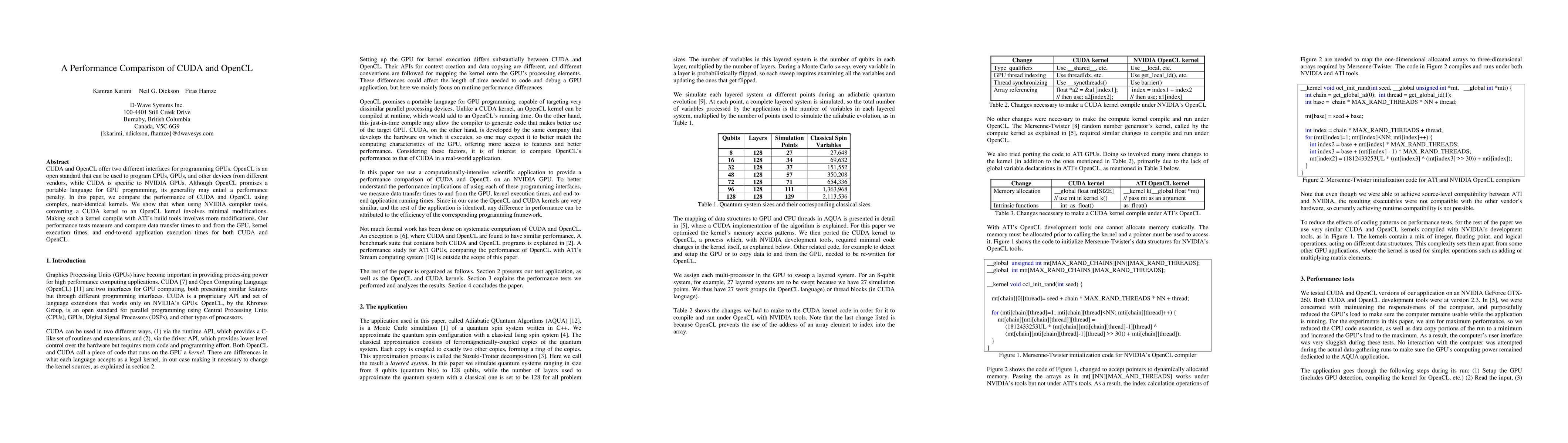 CUDA and OpenCL are two different frameworks for GPU programming. OpenCL is an open standard that can be used to program CPUs, GPUs, and other devices from different vendors, while CUDA is specific to NVIDIA GPUs. Although OpenCL promises a portable language for GPU programming, its generality may entail a performance penalty. In this paper, we use complex, near-identical kernels from a Quantum Monte Carlo application to compare the performance of CUDA and OpenCL. We show that when using NVIDIA compiler tools, converting a CUDA kernel to an OpenCL kernel involves minimal modifications. Making such a kernel compile with ATI's build tools involves more modifications. Our performance tests measure and compare data transfer times to and from the GPU, kernel execution times, and end-to-end application execution times for both CUDA and OpenCL.