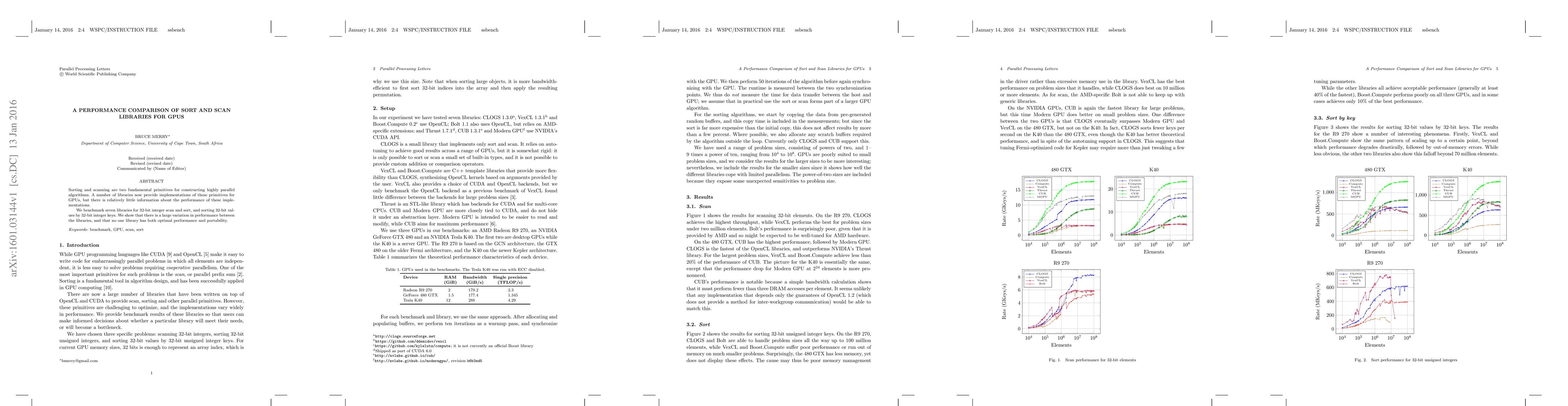 Sorting and scanning are two fundamental primitives for constructing highly parallel algorithms. A number of libraries now provide implementations of these primitives for GPUs, but there is relatively little information about the performance of these implementations. We benchmark seven libraries for 32-bit integer scan and sort, and sorting 32-bit values by 32-bit integer keys. We show that there is a large variation in performance between the libraries, and that no one library has both optimal performance and portability.