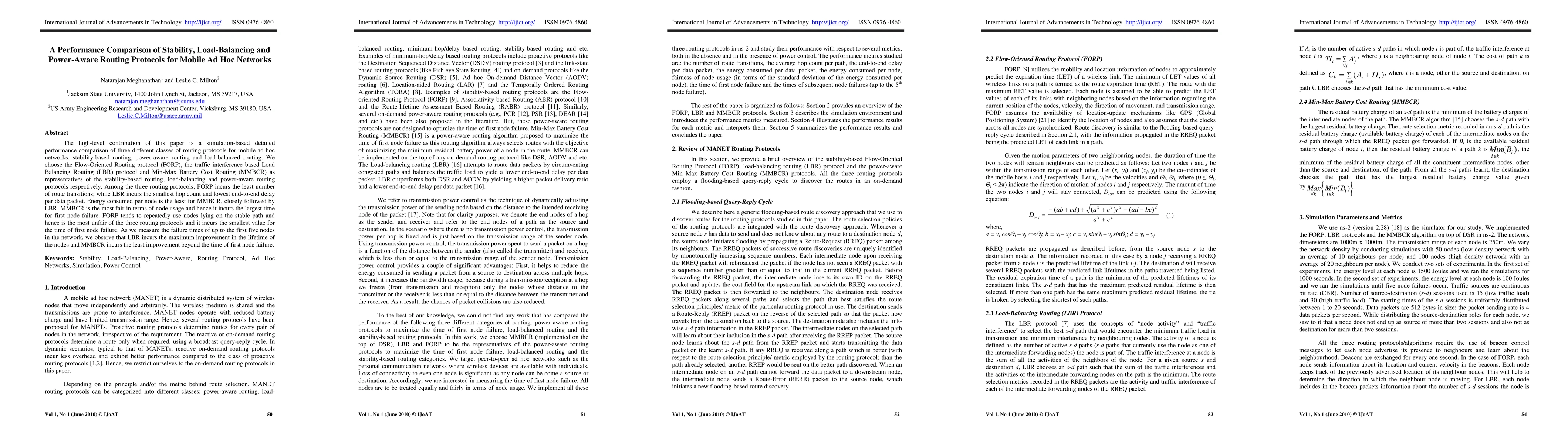 This paper conducts a simulation-based performance comparison of three routing protocols for mobile ad hoc networks: FORP, LBR, and MMBCR. FORP minimizes route transitions, LBR reduces hop count and delay, while MMBCR optimizes energy consumption and node fairness, though it shows the least improvement in node lifetime beyond the first failure.