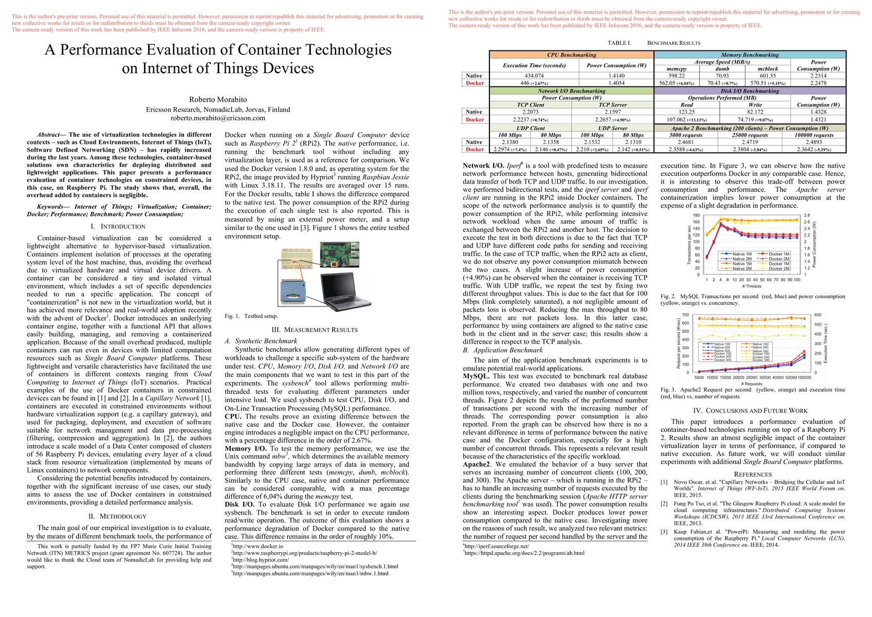 This paper evaluates the performance of container technologies on IoT devices, specifically Raspberry Pi, finding that containers introduce minimal overhead, making them suitable for lightweight applications.