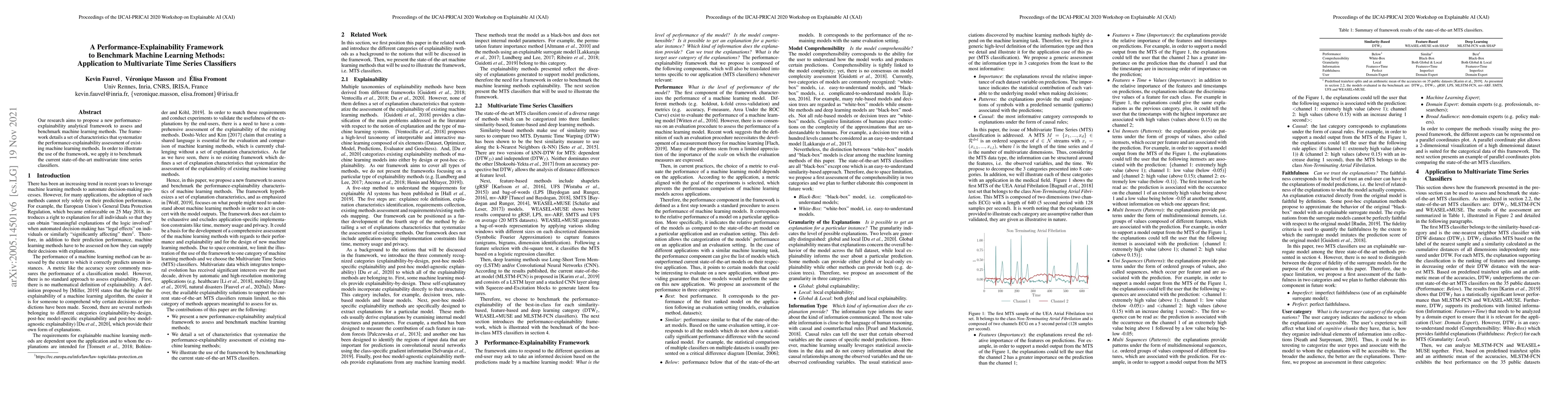 This paper introduces a performance-explainability framework for assessing machine learning methods, detailing characteristics to systematize the evaluation. The framework is applied to benchmark state-of-the-art multivariate time series classifiers.