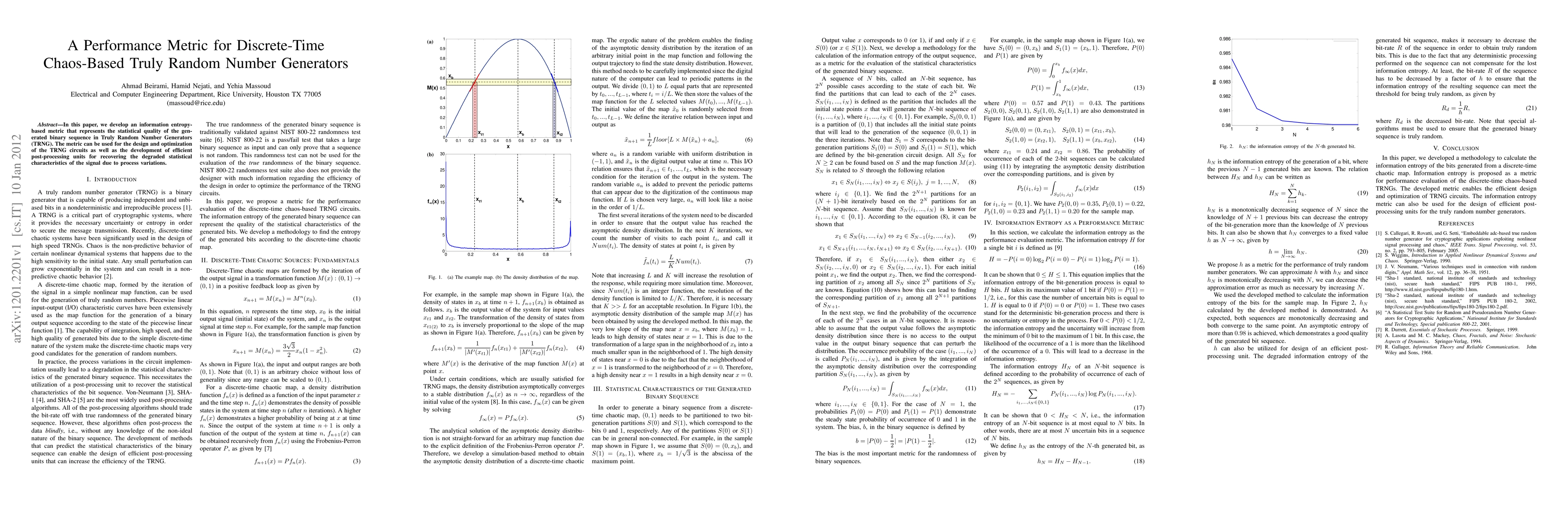 This paper introduces an information entropy-based metric to evaluate the statistical quality of binary sequences from discrete-time chaos-based Truly Random Number Generators (TRNG). The proposed metric aids in the design and optimization of TRNG circuits and enhances the development of post-processing units to improve signal quality despite process variations.
