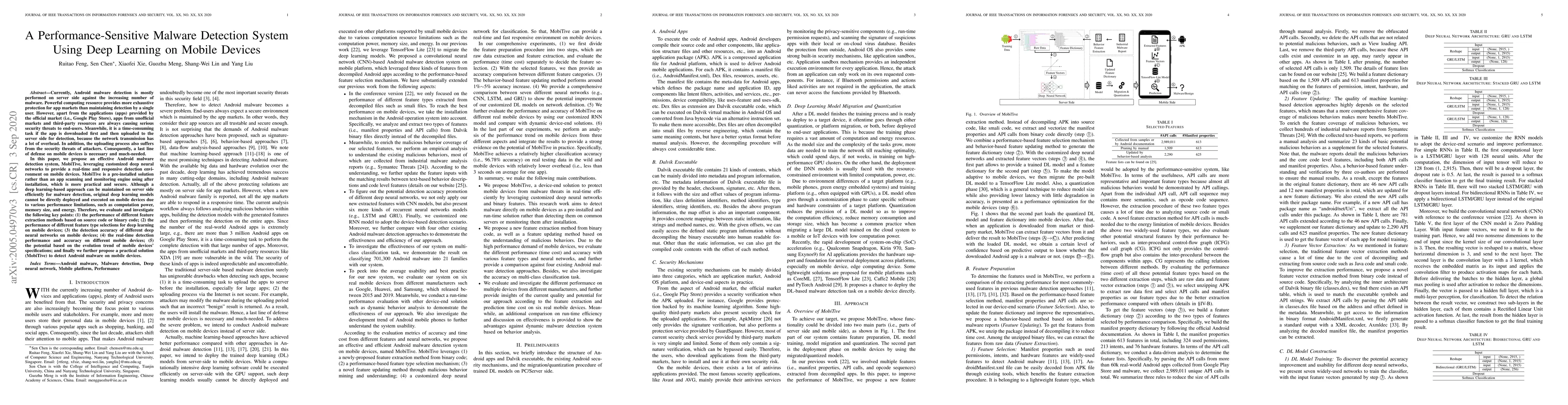 This paper proposes MobiTive, a performance-sensitive malware detection system using deep learning on mobile devices to address security threats from unofficial app markets. It evaluates various feature extraction methods, feature types, and neural network models to optimize detection accuracy and performance on mobile devices.