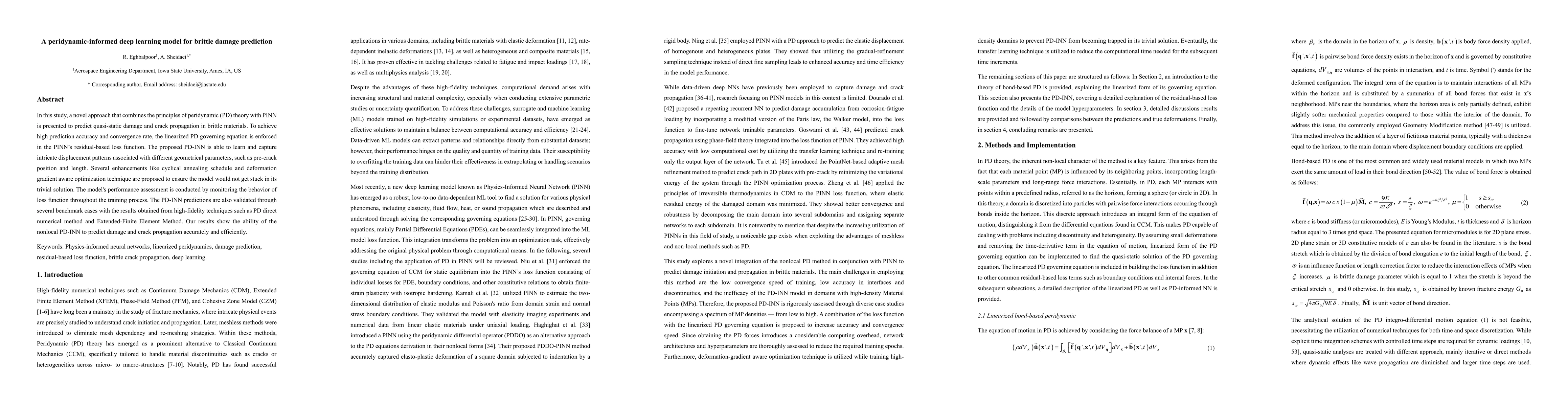 This paper introduces a peridynamic-informed deep learning model (PD-INN) that combines peridynamic theory with physics-informed neural networks (PINN) to predict brittle damage and crack propagation in materials. The model demonstrates high accuracy and efficiency through enhanced training techniques and validation against high-fidelity methods.
