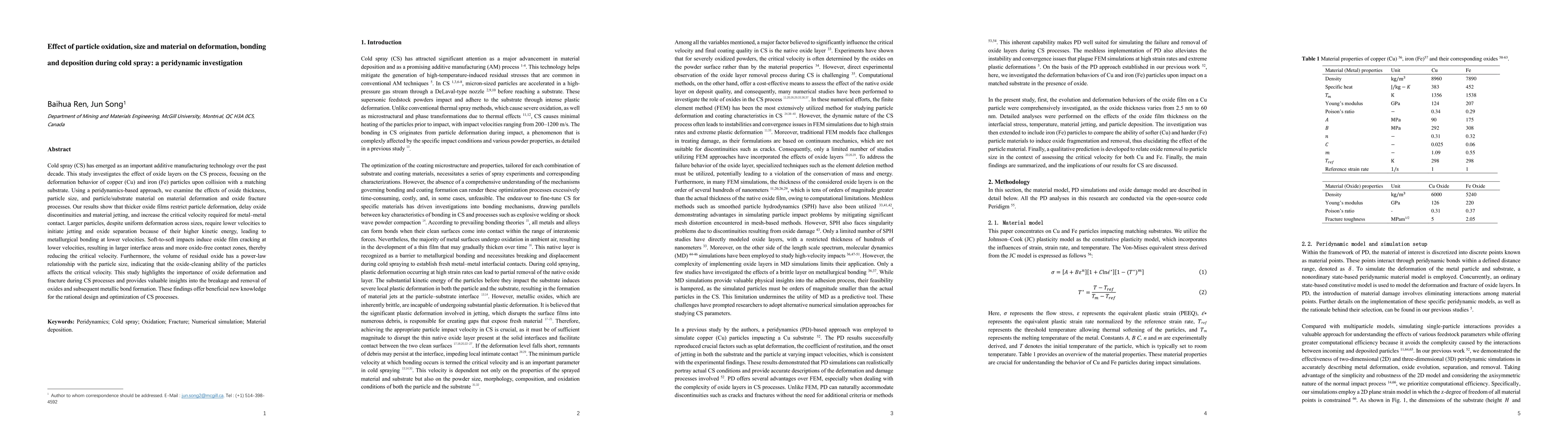 This research uses peridynamic modeling to study how particle size, oxidation, and material type affect cold spray deposition properties, revealing that smaller particles with thicker oxide layers and harder materials reduce oxide removal and adhesion success, thus optimizing deposition parameters. The proposed framework correlates particle size with critical velocity, enhancing the understanding and efficiency of cold spray processes.