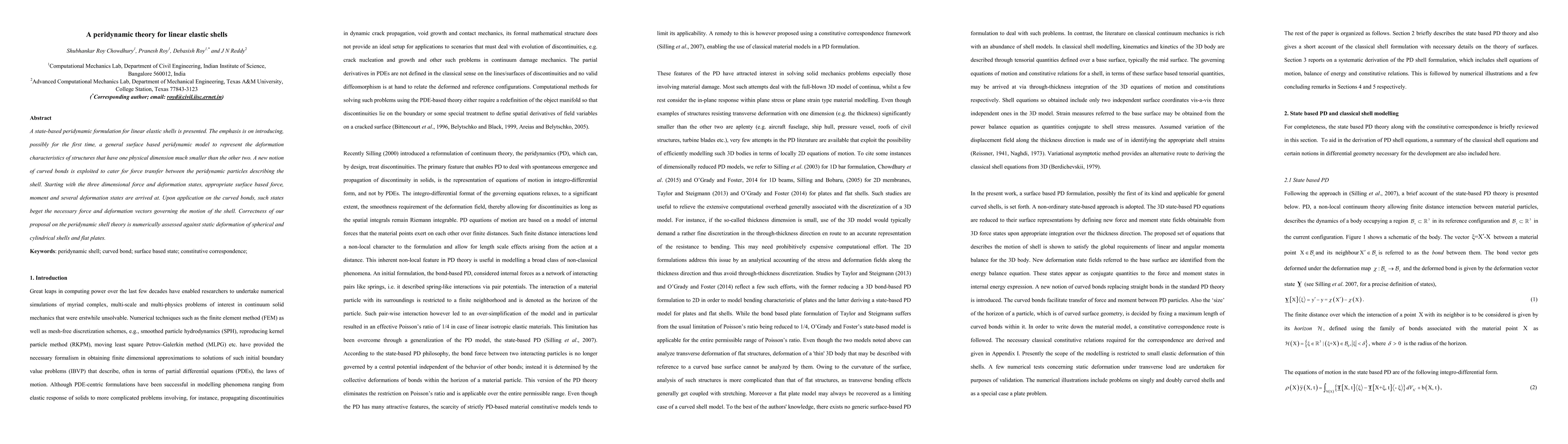 A state-based peridynamic formulation for linear elastic shells is presented. The emphasis is on introducing, possibly for the first time, a general surface based peridynamic model to represent the deformation characteristics of structures that have one physical dimension much smaller than the other two. A new notion of curved bonds is exploited to cater for force transfer between the peridynamic particles describing the shell. Starting with the three dimensional force and deformation states, appropriate surface based force, moment and several deformation states are arrived at. Upon application on the curved bonds, such states beget the necessary force and deformation vectors governing the motion of the shell. Correctness of our proposal on the peridynamic shell theory is numerically assessed against static deformation of spherical and cylindrical shells and flat plates.