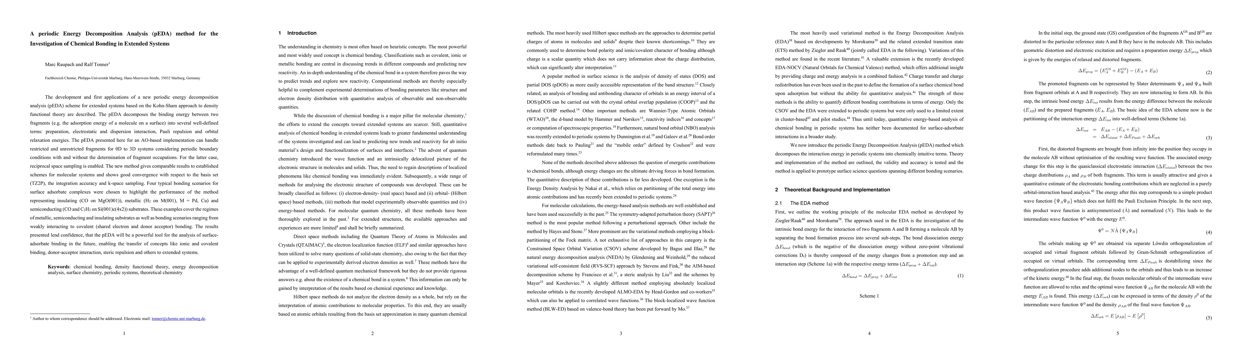 A new method called periodic Energy Decomposition Analysis (pEDA) is introduced to investigate chemical bonding in extended systems, providing comparable results to established schemes for molecular systems.