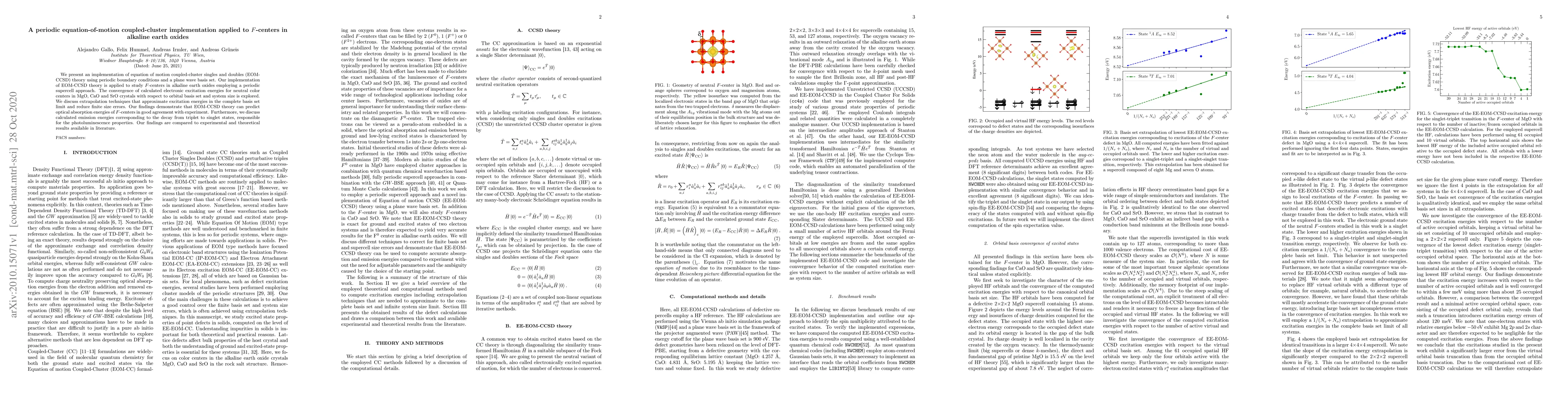 This paper introduces a periodic EOM-CCSD implementation for studying $F$-centers in alkaline earth oxides, demonstrating its ability to predict optical absorption and photoluminescence properties in good agreement with experimental data. The study explores convergence and extrapolation techniques to minimize finite size errors.