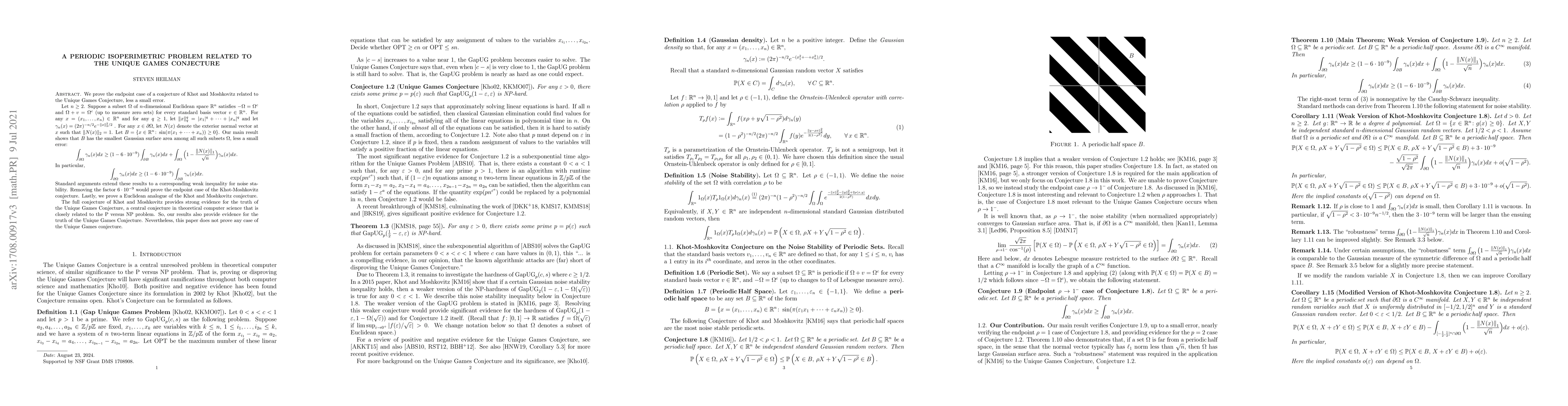 We prove the endpoint case of a conjecture of Khot and Moshkovitz related to the Unique Games Conjecture, less a small error. Let $n\geq2$. Suppose a subset $\Omega$ of $n$-dimensional Euclidean space $\mathbb{R}^{n}$ satisfies $-\Omega=\Omega^{c}$ and $\Omega+v=\Omega^{c}$ (up to measure zero sets) for every standard basis vector $v\in\mathbb{R}^{n}$. For any $x=(x_{1},\ldots,x_{n})\in\mathbb{R}^{n}$ and for any $q\geq1$, let $\|x\|_{q}^{q}=|x_{1}|^{q}+\cdots+|x_{n}|^{q}$ and let $\gamma_{n}(x)=(2\pi)^{-n/2}e^{-\|x\|_{2}^{2}/2}$ . For any $x\in\partial\Omega$, let $N(x)$ denote the exterior normal vector at $x$ such that $\|N(x)\|_{2}=1$. Let $B=\{x\in\mathbb{R}^{n}\colon \sin(\pi(x_{1}+\cdots+x_{n}))\geq0\}$. Our main result shows that $B$ has the smallest Gaussian surface area among all such subsets $\Omega$, less a small error: $$ \int_{\partial\Omega}\gamma_{n}(x)dx\geq(1-6\cdot 10^{-9})\int_{\partial B}\gamma_{n}(x)dx+\int_{\partial\Omega}\Big(1-\frac{\|N(x)\|_{1}}{\sqrt{n}}\Big)\gamma_{n}(x)dx. $$ In particular, $$ \int_{\partial\Omega}\gamma_{n}(x)dx\geq(1-6\cdot 10^{-9})\int_{\partial B}\gamma_{n}(x)dx. $$ Standard arguments extend these results to a corresponding weak inequality for noise stability. Removing the factor $6\cdot 10^{-9}$ would prove the endpoint case of the Khot-Moshkovitz conjecture. Lastly, we prove a Euclidean analogue of the Khot and Moshkovitz conjecture. The full conjecture of Khot and Moshkovitz provides strong evidence for the truth of the Unique Games Conjecture, a central conjecture in theoretical computer science that is closely related to the P versus NP problem. So, our results also provide evidence for the truth of the Unique Games Conjecture. Nevertheless, this paper does not prove any case of the Unique Games conjecture.