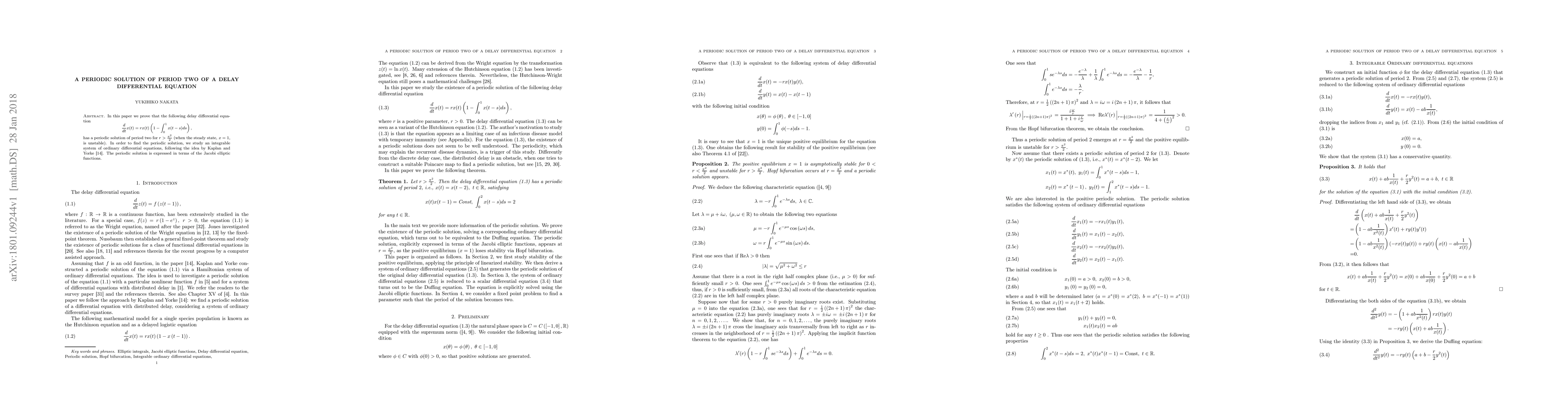 This paper proves the existence of a periodic solution of period two for a delay differential equation when the steady state is unstable, using an integrable system approach and expressing the solution in terms of Jacobi elliptic functions. The critical parameter value for this behavior is found to be \( r > \frac{\pi^2}{2} \).