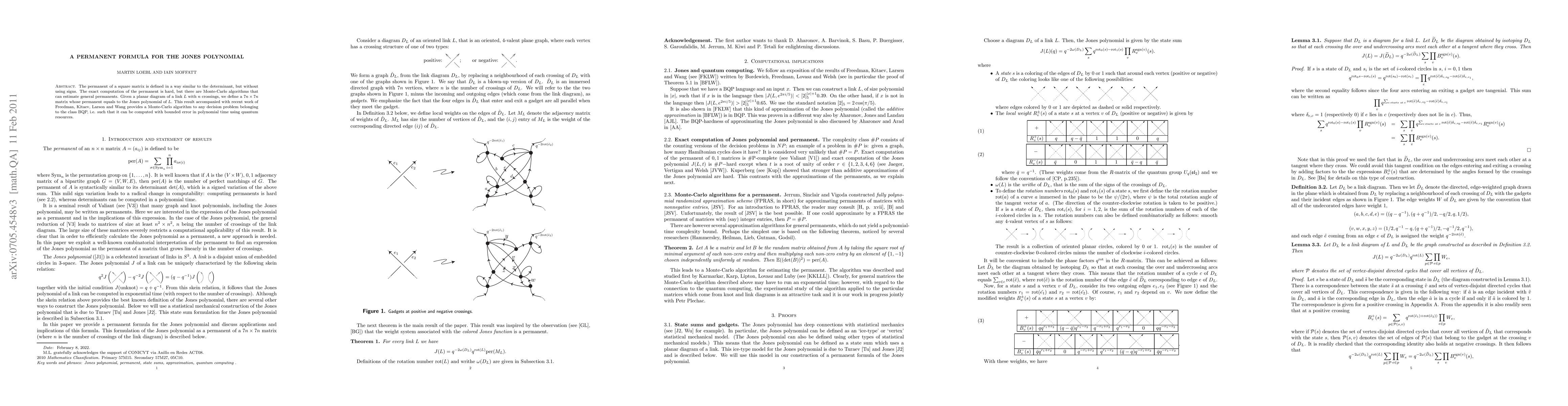 The paper presents a matrix whose permanent equals the Jones polynomial of a link, enabling a Monte-Carlo algorithm for computing such polynomials. This result, combined with recent quantum computing advancements, provides a pathway to solve BQP problems using quantum resources.