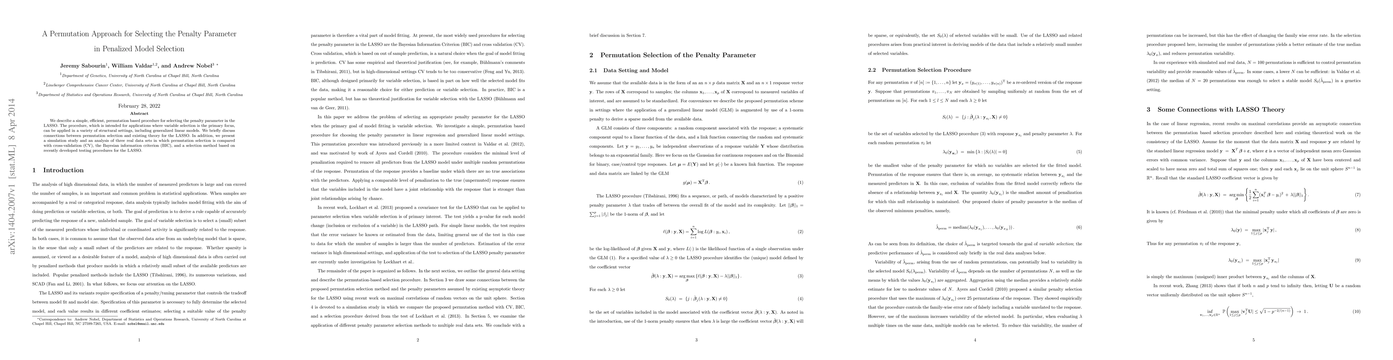 A new method using permutations is proposed to select the penalty parameter in LASSO models, compared to traditional cross-validation and Bayesian information criterion methods in simulation studies on real data sets.