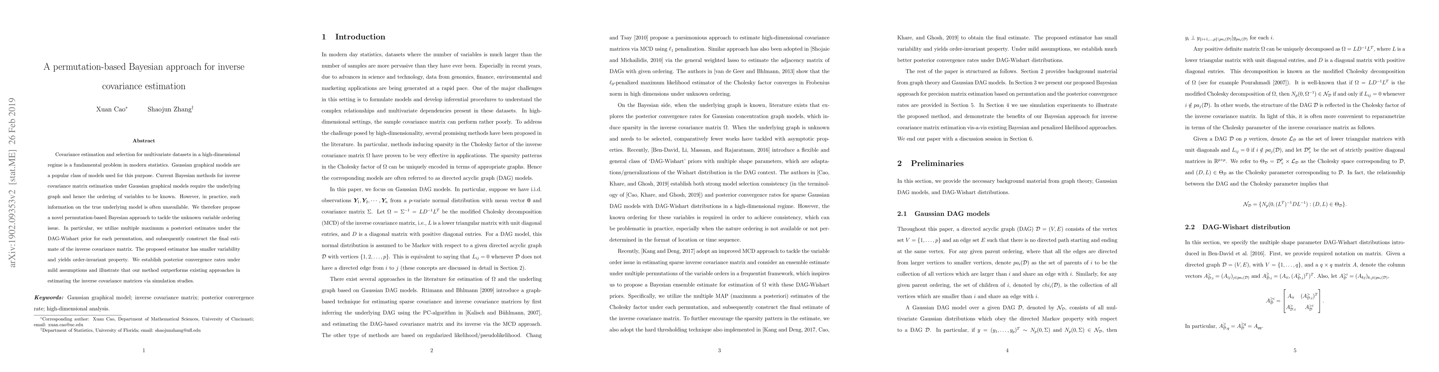 This paper proposes a permutation-based Bayesian method for inverse covariance estimation in high-dimensional Gaussian graphical models, addressing the issue of unknown variable ordering. The approach uses multiple maximum a posteriori estimates under the DAG-Wishart prior for each permutation to construct a final, order-invariant inverse covariance matrix estimator, which shows better performance than existing methods in simulations.