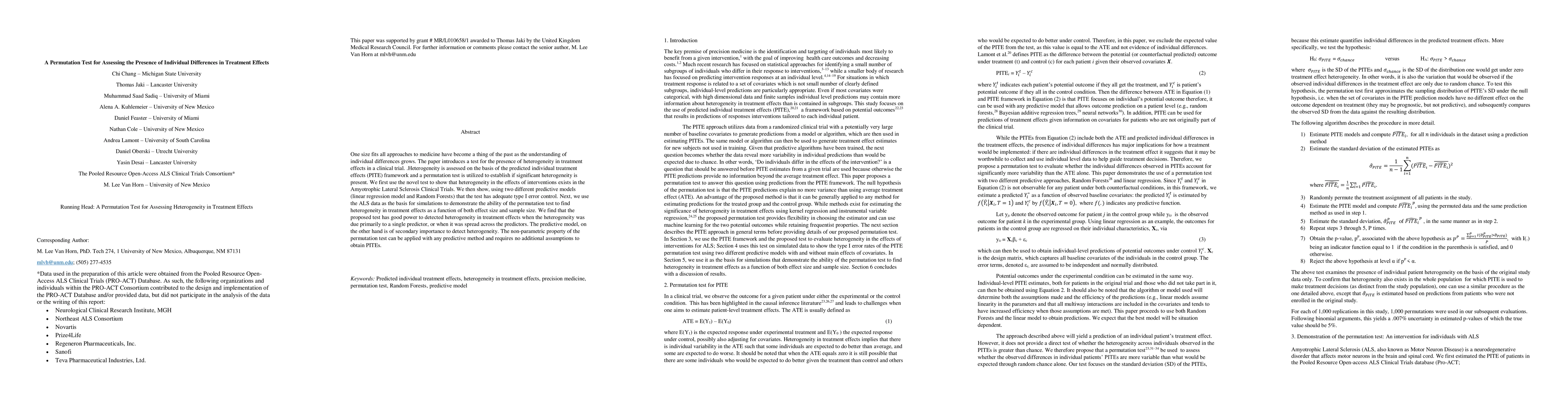 One size fits all approaches to medicine have become a thing of the past as the understanding of individual differences grows. The paper introduces a test for the presence of heterogeneity in treatment effects in a clinical trial. Heterogeneity is assessed on the basis of the predicted individual treatment effects (PITE) framework and a permutation test is utilized to establish if significant heterogeneity is present. We first use the novel test to show that heterogeneity in the effects of interventions exists in the Amyotrophic Lateral Sclerosis Clinical Trials. We then show, using two different predictive models (linear regression model and Random Forests) that the test has adequate type I error control. Next, we use the ALS data as the basis for simulations to demonstrate the ability of the permutation test to find heterogeneity in treatment effects as a function of both effect size and sample size. We find that the proposed test has good power to detected heterogeneity in treatment effects when the heterogeneity was due primarily to a single predictor, or when it was spread across the predictors. The predictive model, on the other hand is of secondary importance to detect heterogeneity. The non-parametric property of the permutation test can be applied with any predictive method and requires no additional assumptions to obtain PITEs.