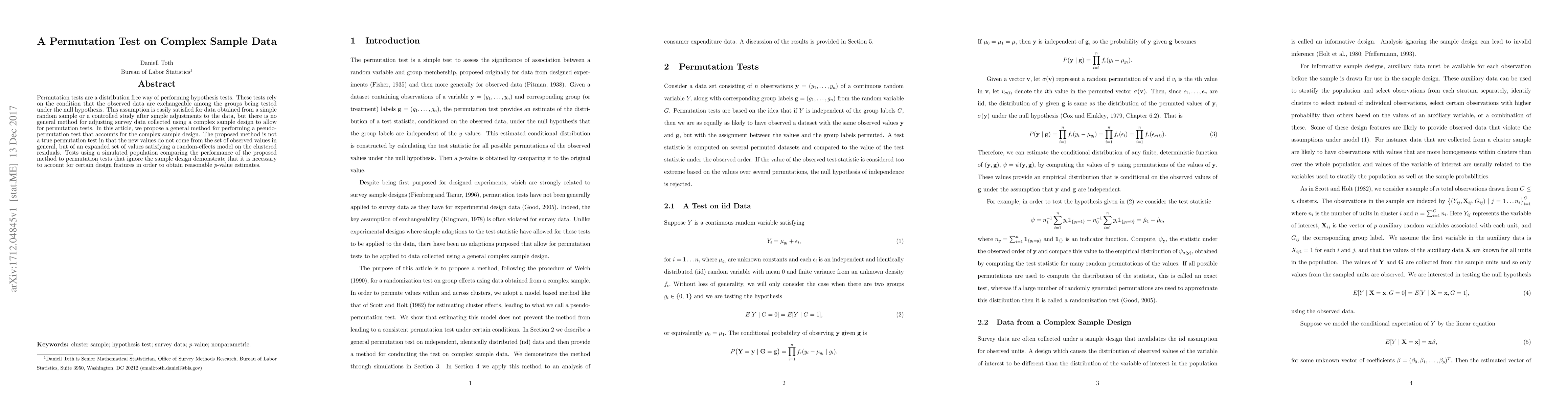 This paper proposes a pseudo-permutation test method to handle complex sample designs in hypothesis testing, addressing the lack of general methods for such data. The method generates values from an expanded set based on a random-effects model, and simulations show its necessity for accurate p-value estimates.