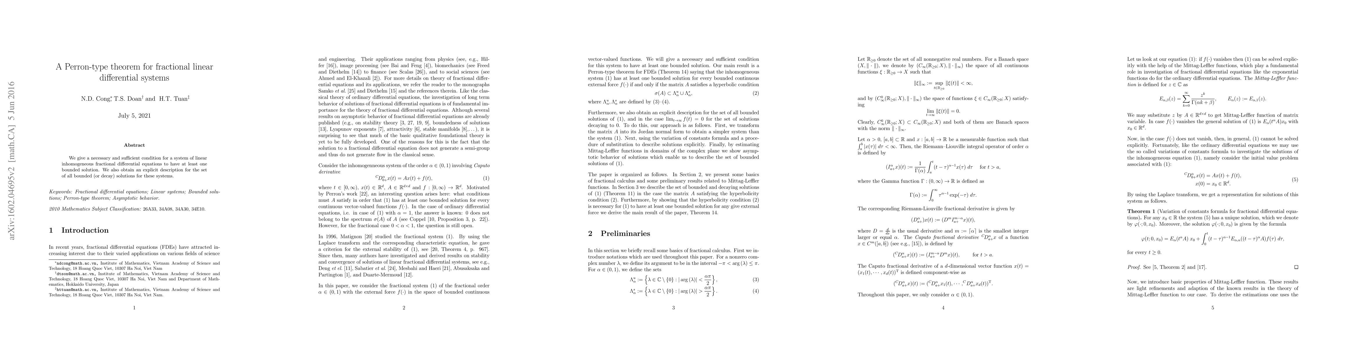 We give a necessary and sufficient condition for a system of linear inhomogeneous fractional differential equations to have at least one bounded solution. We also obtain an explicit description for the set of all bounded (or decay) solutions for these systems.