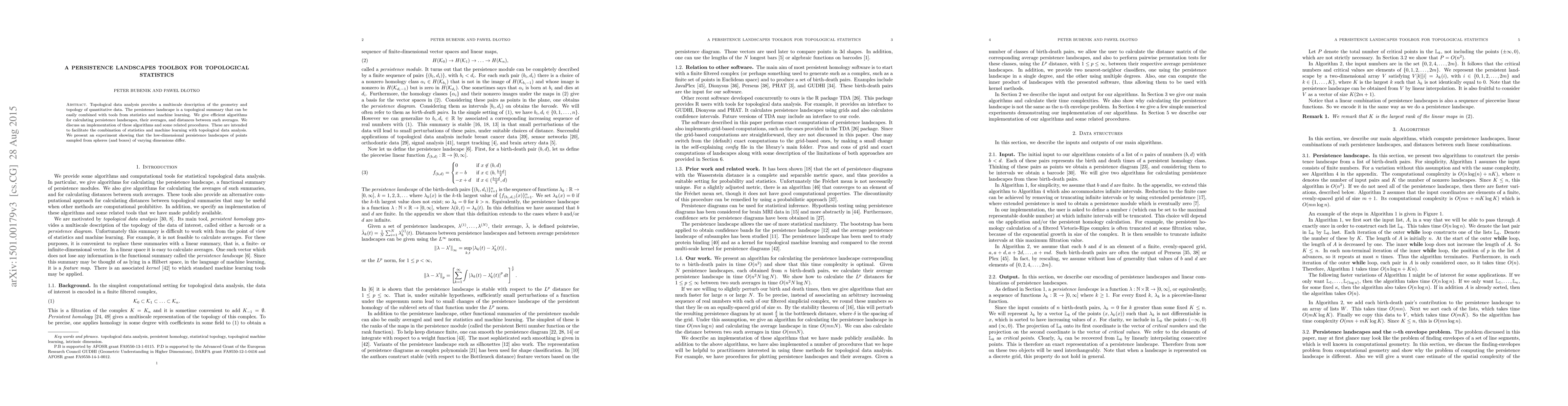Topological data analysis provides a multiscale description of the geometry and topology of quantitative data. The persistence landscape is a topological summary that can be easily combined with tools from statistics and machine learning. We give efficient algorithms for calculating persistence landscapes, their averages, and distances between such averages. We discuss an implementation of these algorithms and some related procedures. These are intended to facilitate the combination of statistics and machine learning with topological data analysis. We present an experiment showing that the low-dimensional persistence landscapes of points sampled from spheres (and boxes) of varying dimensions differ.