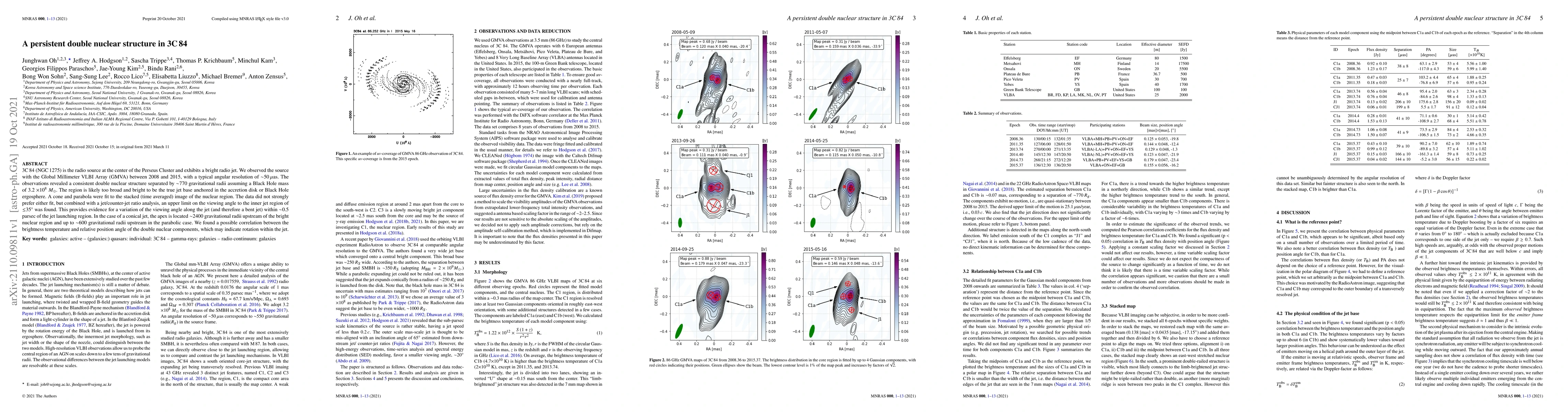 3C 84 (NGC 1275) is the radio source at the center of the Perseus Cluster and exhibits a bright radio jet. We observed the source with the Global Millimeter VLBI Array (GMVA) between 2008 and 2015, with a typical angular resolution of $\sim$50 $\mu$as. The observations revealed a consistent double nuclear structure separated by $\sim$770 gravitational radii assuming a Black Hole mass of 3.2 $\times 10^{8}$ $M_{\odot}$. The region is likely too broad and bright to be the true jet base anchored in the accretion disk or Black Hole ergosphere. A cone and parabola were fit to the stacked (time averaged) image of the nuclear region. The data did not strongly prefer either fit, but combined with a jet/counter-jet ratio analysis, an upper limit on the viewing angle to the inner jet region of $\leq$35$^{\circ}$ was found. This provides evidence for a variation of the viewing angle along the jet (and therefore a bent jet) within $\sim$0.5 parsec of the jet launching region. In the case of a conical jet, the apex is located $\sim$2400 gravitational radii upstream of the bright nuclear region and up to $\sim$600 gravitational radii upstream in the parabolic case. We found a possible correlation between the brightness temperature and relative position angle of the double nuclear components, which may indicate rotation within the jet.