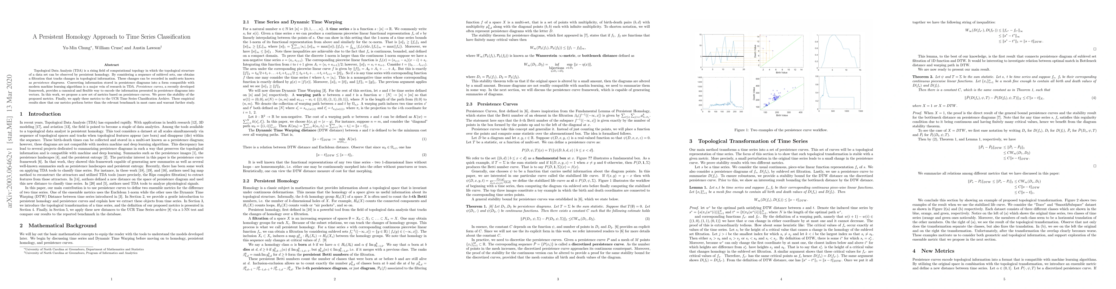 This paper proposes new metrics based on persistence curves derived from persistent homology for time series classification. The authors prove the stability of these metrics and demonstrate their effectiveness through experiments on the UCR Time Series Classification Archive, showing superior performance compared to existing benchmarks.