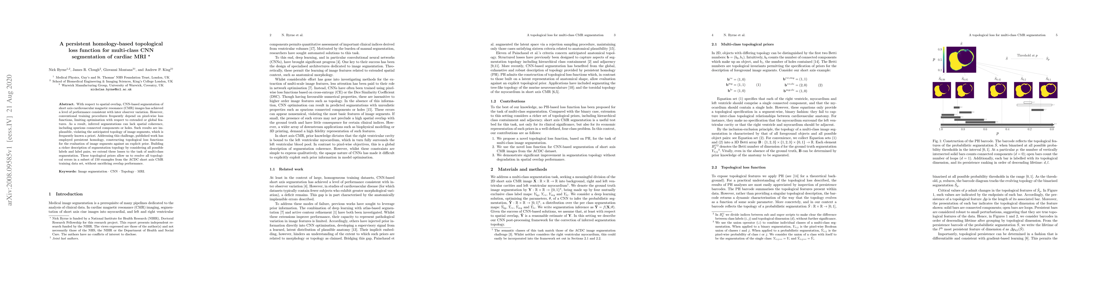 This paper proposes a persistent homology-based topological loss function to improve multi-class CNN segmentation of cardiac MRI, addressing spatial coherence issues and ensuring the anticipated topology of image segments. The method successfully resolves topological errors without sacrificing overlap performance on a subset of CMR training data.