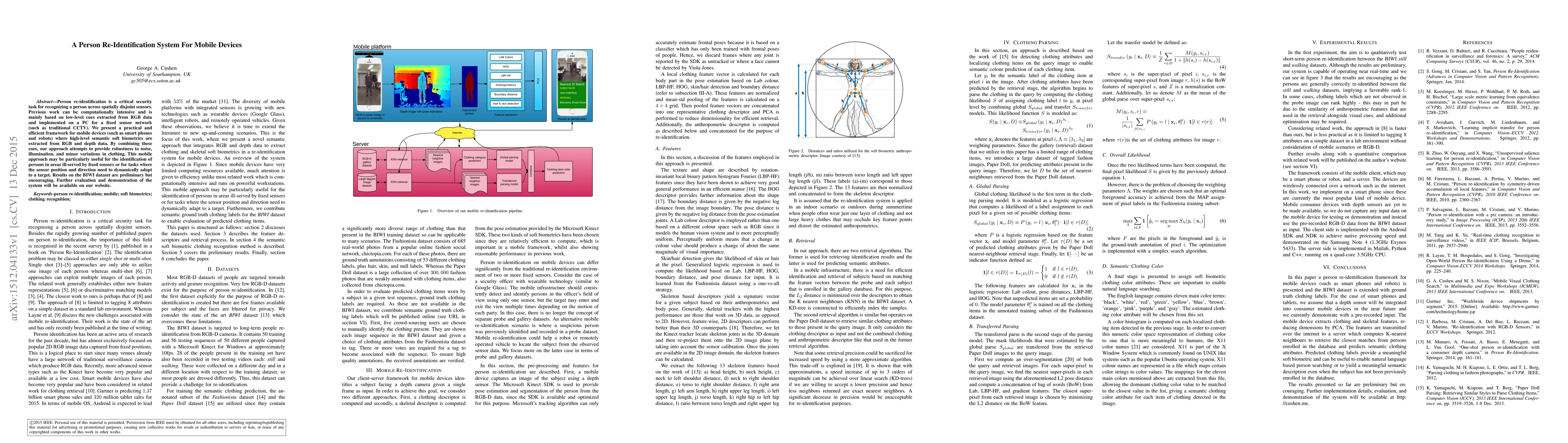 Person re-identification is a critical security task for recognizing a person across spatially disjoint sensors. Previous work can be computationally intensive and is mainly based on low-level cues extracted from RGB data and implemented on a PC for a fixed sensor network (such as traditional CCTV). We present a practical and efficient framework for mobile devices (such as smart phones and robots) where high-level semantic soft biometrics are extracted from RGB and depth data. By combining these cues, our approach attempts to provide robustness to noise, illumination, and minor variations in clothing. This mobile approach may be particularly useful for the identification of persons in areas ill-served by fixed sensors or for tasks where the sensor position and direction need to dynamically adapt to a target. Results on the BIWI dataset are preliminary but encouraging. Further evaluation and demonstration of the system will be available on our website.