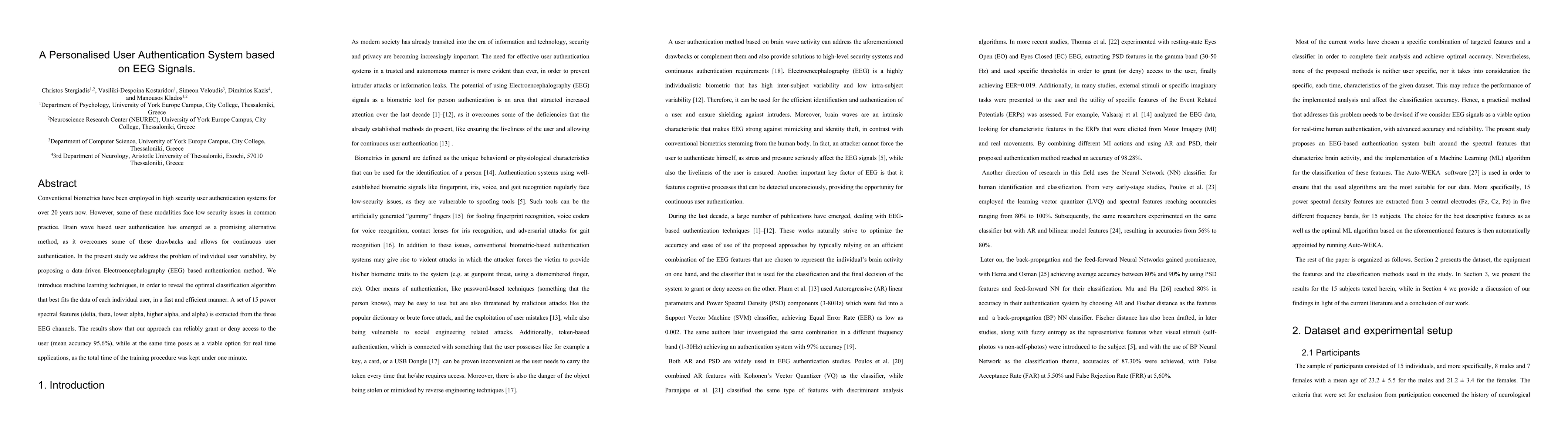 This paper proposes a personalized EEG-based authentication system using machine learning to address individual user variability, achieving a mean accuracy of 95.6% and a training time under one minute, making it suitable for real-time applications.