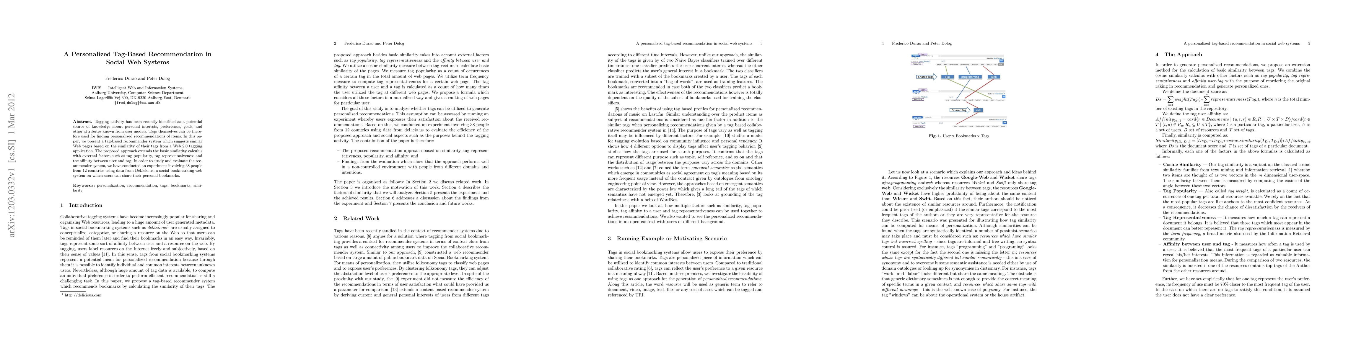 This paper introduces a personalized tag-based recommender system that suggests similar web pages based on tag similarity in a social web context. The system incorporates factors like tag popularity and user-tag affinity for enhanced recommendation accuracy, evaluated through an experiment involving users from 12 countries on Del.icio.us.