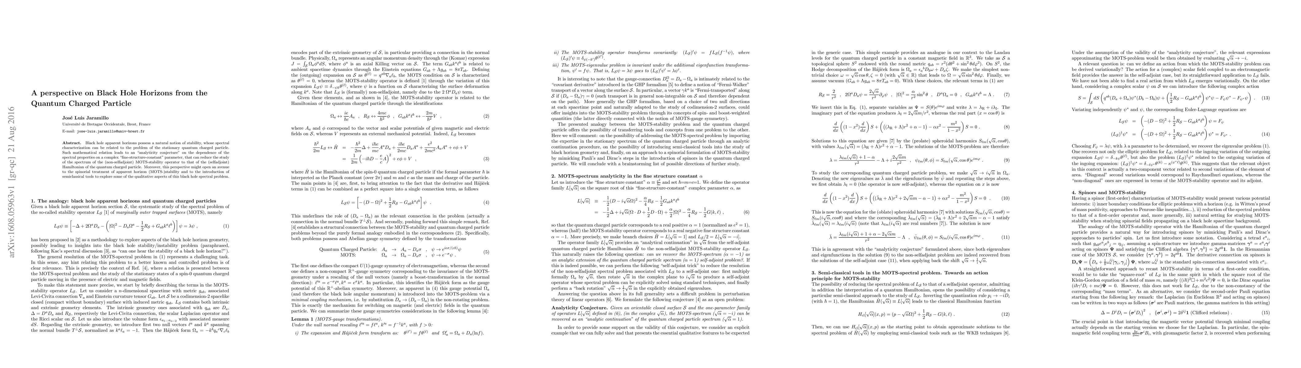 Black hole apparent horizons possess a natural notion of stability, whose spectral characterization can be related to the problem of the stationary quantum charged particle. Such mathematical relation leads to an "analyticity conjecture" on the dependence of the spectral properties on a complex "fine-structure-constant" parameter, that can reduce the study of the spectrum of the (non-selfadjoint) MOTS-stability operator to that of the (selfadjoint) Hamiltonian of the quantum charged particle. Moreover, this perspective might open an avenue to the spinorial treatment of apparent horizon (MOTS-)stability and to the introduction of semiclassical tools to explore some of the qualitative aspects of this black hole spectral problem.