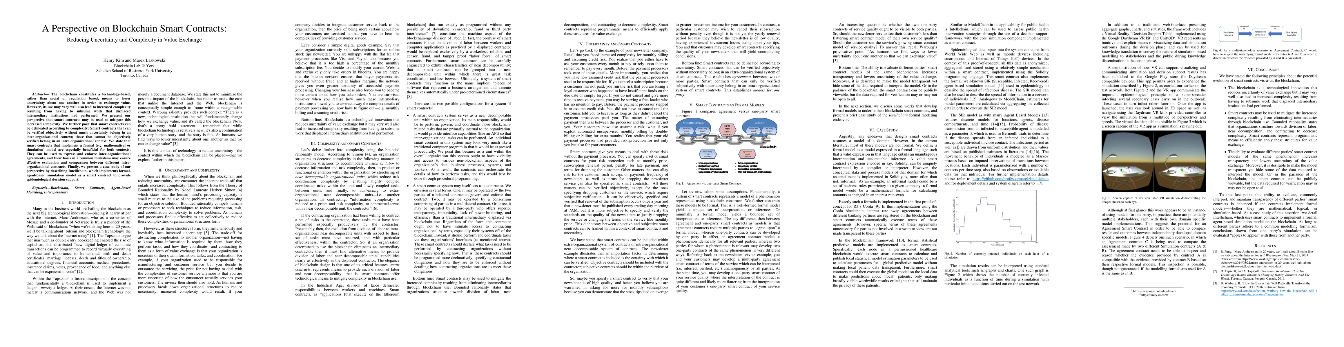 The blockchain constitutes a technology-based, rather than social or regulation based, means to lower uncertainty about one another in order to exchange value. However, its use may very well also lead to increased complexity resulting from having to subsume work that displaced intermediary institutions had performed. We present our perspective that smart contracts may be used to mitigate this increased complexity. We further posit that smart contracts can be delineated according to complexity: Smart contracts that can be verified objectively without much uncertainty belong in an inter-organizational context; those that cannot be objectively verified belong in an intra-organizational context. We state that smart contracts that implement a formal (e.g. mathematical or simulation) model are especially beneficial for both contexts: They can be used to express and enforce inter-organizational agreements, and their basis in a common formalism may ensure effective evaluation and comparison between different intra-organizational contracts. Finally, we present a case study of our perspective by describing Intellichain, which implements formal, agent-based simulation model as a smart contract to provide epidemiological decision support.