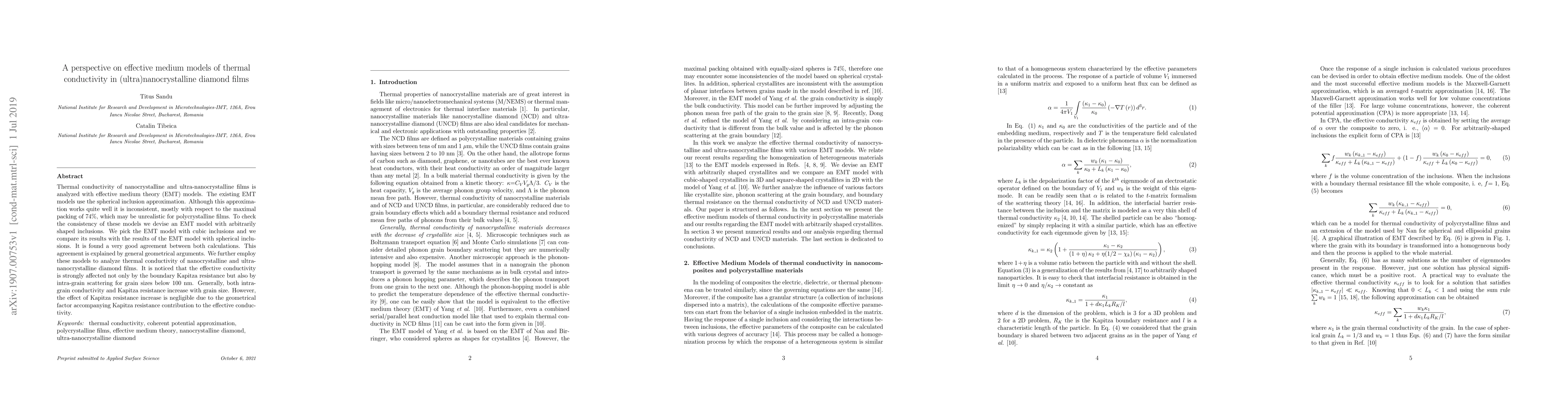 Thermal conductivity of nanocrystalline and ultra-nanocrystalline films is analyzed with effective medium theory (EMT) models. The existing EMT models use the spherical inclusion approximation. Although this approximation works quite well it is inconsistent, mostly with respect to the maximal packing of 74{\%}, which may be unrealistic for polycrystalline films. To check the consistency of these models we devise an EMT model with arbitrarily shaped inclusions. We pick the EMT model with cubic inclusions and we compare its results with the results of the EMT model with spherical inclusions. It is found a very good agreement between both calculations. This agreement is explained by general geometrical arguments. We further employ these models to analyze thermal conductivity of nanocrystalline and ultra-nanocrystalline diamond films. It is noticed that the effective conductivity is strongly affected not only by the boundary Kapitza resistance but also by intra-grain scattering for grain sizes below 100 nm. Generally, both intra-grain conductivity and Kapitza resistance increase with grain size. However, the effect of Kapitza resistance increase is negligible due to the geometrical factor accompanying Kapitza resistance contribution to the effective conductivity.