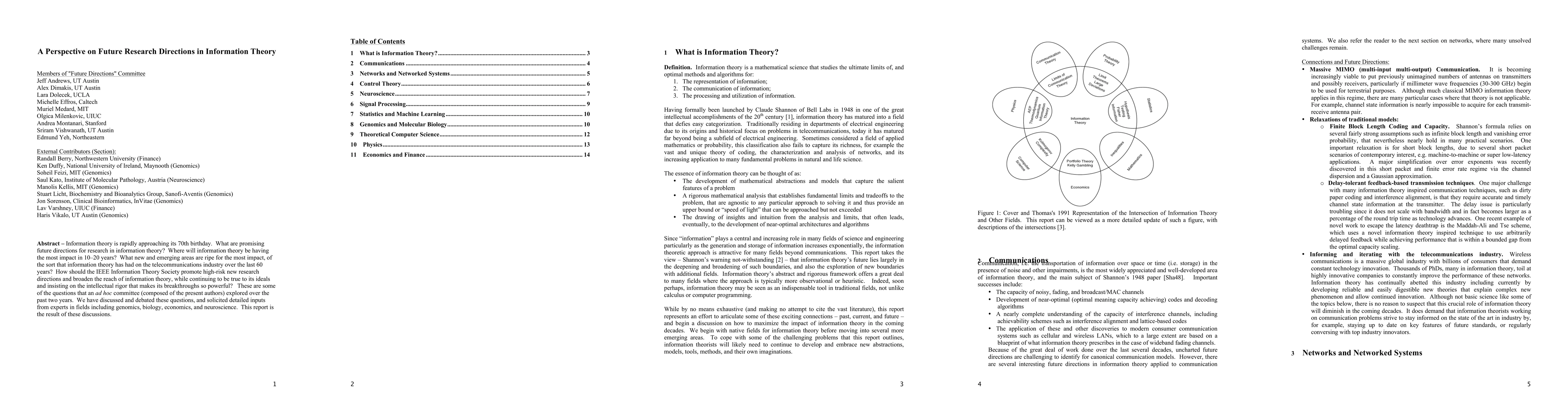 This paper explores potential future research directions in information theory, considering its impact over the next 10-20 years, and suggests ways for the IEEE Information Theory Society to promote high-risk research while maintaining intellectual rigor. It synthesizes insights from experts across genomics, biology, economics, and neuroscience.